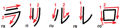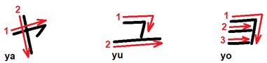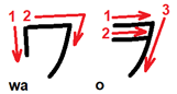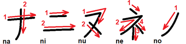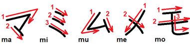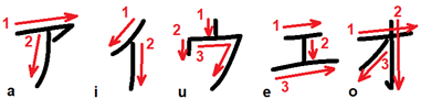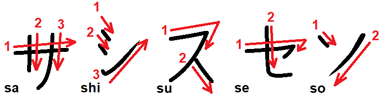 Beim Schreiben der Zeichen ist es wichtig, die richtige Reihenfolge der Striche und ihre Richtung zu beachten. Das ist notwendig, weil es von der Richtung abhängig ist, wo die charakteristischen Serifen entstehen, wo der Strich dick beginnt und wo er sanft ausläuft, welches dynamische Schriftbild entsteht. Beim Kugelschreiber ist das im Ergebnis egal, aber bei Füller, Feder oder gar Pinsel nicht. Viele Typen versuchen diese charakteristischen Verdickungen der Pinselschrift nachzuahmen, und das ist dann insgesamt nur dann ein plausibles Gesamtbild, wenn die Position der dicken und dünnen Stellen und der Serifen korrekt ist. Daher werden hier immer Graphiken mit der genauen Art zu schreiben abgebildet, 1, 2, 3 kennzeichnet die Reihenfolge, die Zahl steht am Strichanfang, der Pfeil gibt die Richtung vor. Am besten lernt man das von Anfang an, dann muß man nicht nachher mühsam umlernen. Da Katakana noch stärker reduziert sind, gibt es nur zwei Zeichen, die überhaupt die vier Striche erreichen. Bei einigen Katakana ist es besonders wichtig, die Strich-Richtung korrekt zu beachten, weil die Richtung und die dadurch erzeugten Verdickungen bedeutungstragend sind, das sind SO und N sowie SHI und TSU.