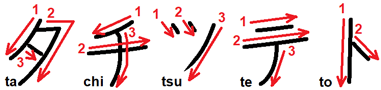 Ohne die "zwei kleinen Striche rechts oben" (Dakuten, Nigori-ten, Ten-ten) wird die Silbe stimmlos mit T ausgesprochen, mit den Strichen stimmhaft mit D. So können aus jedem T-Zeichen die D-Silben durch Hinzufügung der beiden Striche erzeugt werden. Drei Silben werden mit Z ausgesprochen, aus DI wird jedoch JI, und aus DU wird ZU. Die Silben DI und DU gibt es nicht.