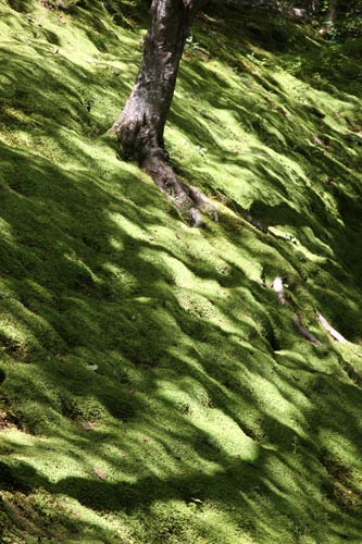 Abb. links: Moos bedeckt den Waldboden. Abb. rechts: Torii vor dem Myouken-do.
