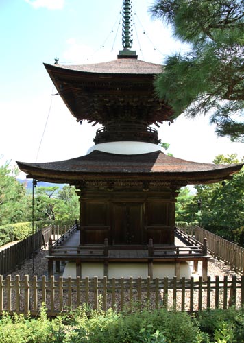 Weiter den Berg hoch kommt man auf gewundenen Wegen hoch zur Taho-to (Taho-tou), einer zweistöckigen Pagode von 12 m Höhe (genannt Heisonkaku), die 1620 von Tsujifuji Naonobu erbaut worden ist und als wichtiges nationales Kulturgut gilt. Stilistisch greift sie zurück in die Momoyama-Zeit. Der untere, quadratische Körper besitzt eine Seitenlänge von 5,64 m. Besonders sehenswert ist die knifflige und wunderbar harmonisch ausgeführte Holzkonstruktion am Übergang zwischen der runden Partie (Kamebara) oberhalb des ersten Daches zur quadratischen Grundform des zweiten Daches mit den vielfach gestaffelten Holzklammern, die in alle Richtungen weisen. Die Dächer sind mit Zypressenrinde gedeckt. Diese Pagode besitzt eine außergewöhnlich schöne Ausgewogenheit zwischen quadratischem Unterbau, rundem Aufbau und den beiden wohlproportionierten Dächern. Solche zweistöckigen Pagoden, in denen man die Stupa-Grundform noch gut erkennen kann, stehen traditionell in Tempelanlagen, in denen die Lotus-Sutra (Hoke-kyo) rezitiert wird, denn darin wird beschrieben, daß, als der historische Buddha Shakyamuni predigte, sich die Erde auftat und eine Stupa von unten emporwuchs und aus der Stupa die Stimme des Buddhas der Vergangenheit (Taho Nyorai) bestätigte, das Buddha Shakyamuni die Wahrheit sprach. Im Innern der Pagode sind Bildnisse von Shaka Nyorai and Taho Nyorai, also dem historischen Buddha und dem Buddha der Vergangenheit. Von der Pagode aus hat man einen hervorragenden Blick nicht nur über den Stadtteil, sondern über ganz Kyoto vom Berg Hiei bis nach Südkyoto. Auch wenn man es durch die Wege nicht so wahrnimmt, sind die beiden Tore, die Haupthalle und die Pagode in einer geraden Ost-West-Achse angeordnet.