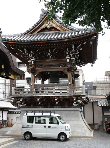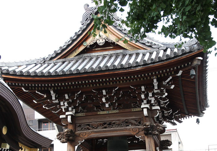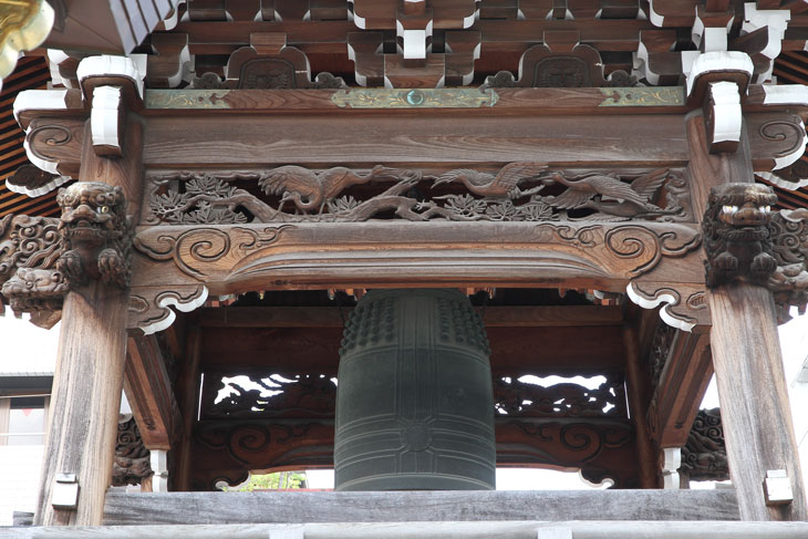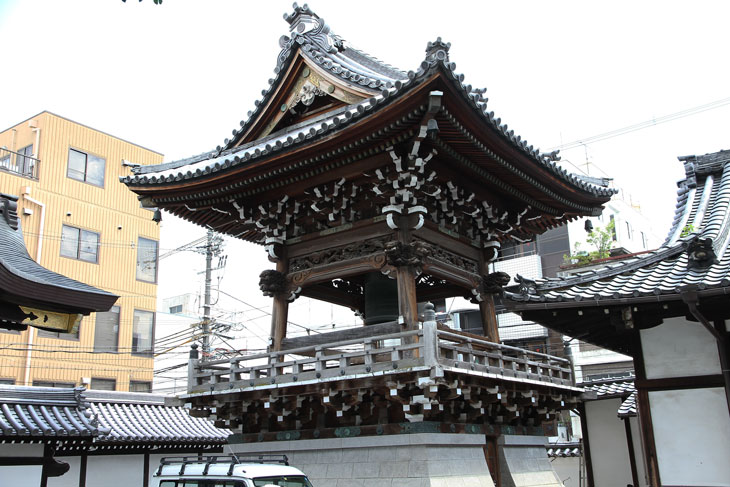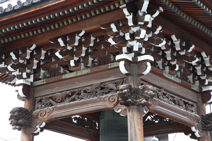 Im Südosteck des Hofes ist der Glockenturm (Shoro) zu finden. Auf trapezförmigem Steinsockel mit konkav eingezogenen Seitenflächen kragt auf Klammerkonstruktionen eine Holzplattform mit umlaufendem Geländer aus. Auf dieser Plattform steht der eigentliche Glockenturm, der oben mit einem geziegelten Irimoya-Dach abgeschlossen wird. Hier lohnt ein Blick auf die vielen Schnitzereien. Insbesondere die waagerecht hervorstehenden Balkenköpfe sind als Shishi geformt, so daß an jeder Ecke zwei zu sehen sind. Auch die Füllungen zwischen den Horizontalbaken sind mit filigranen Schnitzereien versehen.