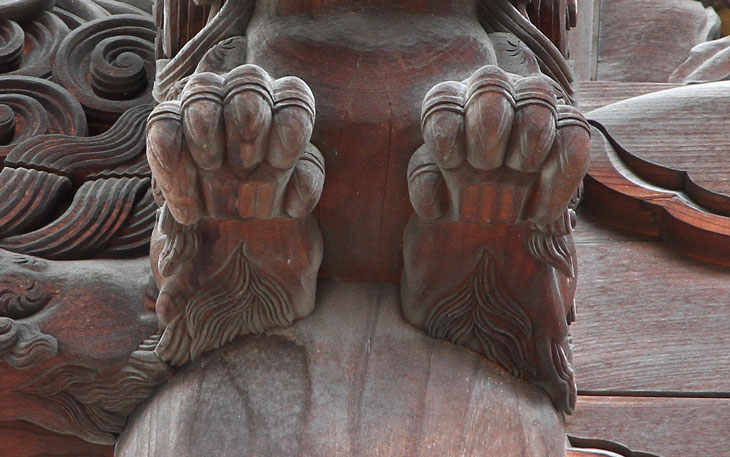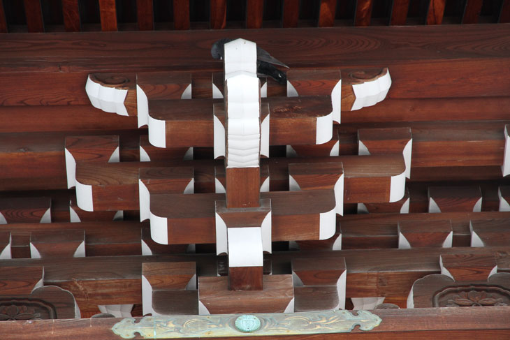 Nördlich des Goeido-mon kommen noch zwei weitere Tore auf der Ostflanke des Tempelgeländes, nach Norden schreitend zunächst hinter einer mit einem Lattenzaun und ebensolchem Tor für den Besucher gesperrten Mauerlücke ein weiteres Tor im Kara-mon-Stil, wieder mit dreieckigen Giebeln seitlich und Karahafu beiderseits in Durchgangsrichtung, so daß sich insgesamt ein kreuzförmiger First ergibt. Das ist das Chokushi-mon, das Tor für die kaiserlichen Gesandten. Auf der Innenseite kann man bis zu diesem Tor vordringen, aber nicht weiter nach Norden, weil hier zum einen der Privatbereich beinnt und zum anderen gerade (2019) Baustelle ist. Die Füllungen der Türflügel sind sehr schön mit filigranen, floralen Schnitzereien versehen. Noch weiter im Norden folgt als viertes und letztes Tor wiederum eines mit geziegeltem Satteldach auf weit ausladender Klammerkonstruktion, das wie ein viel zu schweres Dach auf viel zu leichtem Unterbau wirkt. Das ist das Genkan-mon, das Tor zum Eingangsbereich in den persönlichen Lebensbereich der Bewohner. Auch dieses Tor, in die rechteckig zurückspringende Mauer integriert, so daß hier ein kleiner Vorplatz gebildet wird, ist für den Besucher verschlossen.