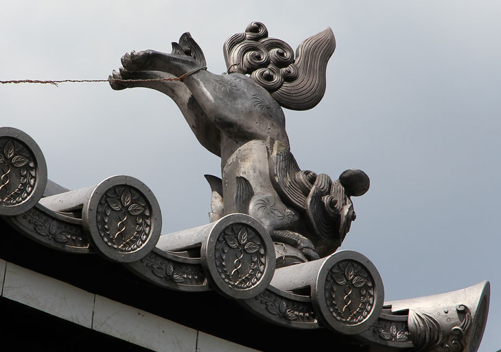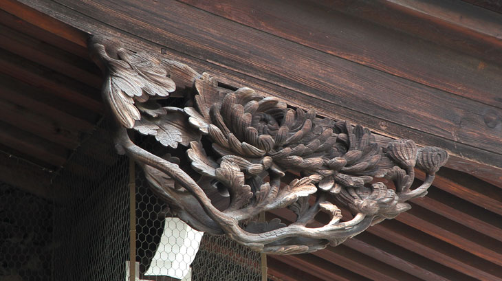 Links: bronzer Kopf eines Verandapfostens. Rechts: Kamon des Tempels an einem Türflügel des Amidado.