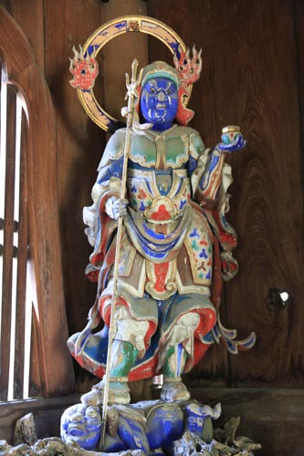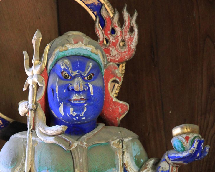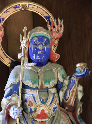 Tamon-ten (der alles Hörende) steht für den Norden. Seine Hautfarbe ist hier blau, aber sonst auch schwarz.