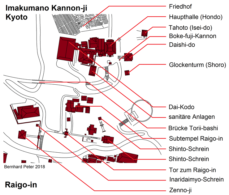 Zurück zur großen Verzweigung: Zum Sennyu-ji geht es rechts, nach links geht es ins Tal hinab 170 m nach Osten über die Brücke Torii-bashi zum Imakumano Kannon-ji. Der Eingang dieses Tempels ist ganz anders als sonst, ohne eigenes Tor, dafür mit einer Brücke, die als eine Art Torii fungiert - hier verschmelzen Einflüsse von Shintoismus und esoterischem Buddhismus miteinander. Zur Gründungslegende gehört, daß hier Kumano Gongen, die Shinto-Manifestation von Kannon, dem Mönch Kobo Daishi (Kukai) erschienen ist, der den Tempel 807 während der Heian-Zeit gegründet haben soll. Gleich einem Torii trennt diese Brücke profan und sakral und reinigt den Darübergehenden symbolisch. Für diesen Tempel wird kein Eintrittsgeld erhoben. Dieser Tempel ist eine Station auf dem Saigoku Sanjusan-sho (Saigoku Sanjuusan-sho), auf einem Pilgerpfad, der insgesamt 33 Kannon-Tempel in der Region Kansai miteinander verbindet, wobei sich die Anzahl 33 an den 33 Erscheinungsformen der Kannon orientiert. Der Imakumano Kannon-ji ist die 15. Station des Pilgerweges und besitzt als Kultbild eine elfköpfige Kannon (Juuichimen Kannon Bosatsu), Davor war der Pilger im Mii-dera (Onjou-ji) in Otsu, Präfektur Shiga, wo er eine Kannon mit wunscherfüllendem Juwel (Nyoirin Kannon) verehrt hat, und nach dem Imakumano Kannon-ji bricht er auf zum Kiyomizu-dera in Kyoto, wo er eine tausendarmige Kannon (Senju Kannon) verehren wird.