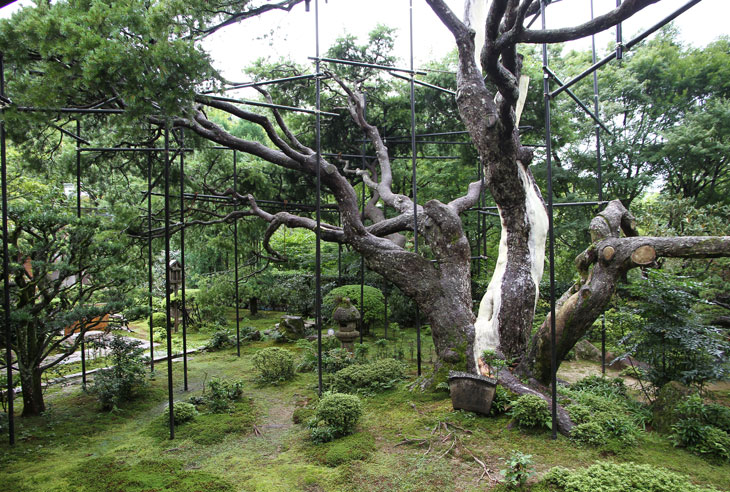 An einem kleinen Wasserbecken mit Wasserfall rechts des Weges vorbei führt der Weg zum Tempel. Auch hier im Vorfeld, im halböffentlichen Bereich, ist der Garten mit erstaunlicher Finesse angelegt und reich an Schönheit. Südlich des Hauptgebäudes (Kyakuden, Gästehalle) steht eine gewaltige alte Kiefer mit mehreren Stämmen, deren Äste reihum von einem Gerüst gestützt werden, das ist die Goyo-no-matsu (fünfnadelige Kiefer), die einen Durchmesser von bis zu 14 m hat. Der über 700 Jahre alte Baum ist ein Höhepunkt der Gärten, zumindest wenn man sein ehrwürdiges Alter berücksichtigt. Schon wenn man sich vom Eingang her nähert, soll die charakteristische Form auffallen, als wolle man durch den Beschnitt eine Art Fuji-san-Form erzeugen. Wenn man das sehen soll, sieht man das auch gerne. Bei nüchterner Betrachtung ist das einfach nur eine uralte Kiefer, die völlig aus der Form geraten ist, schon reichlich Federn lassen mußte und nur mühsam mit Stangen und Gerüsten vor dem Zusammenbrechen bewahrt wird und vermutlich ohne diese ganzen Halterungen beim nächsten Taifun zu Brennholz zertrümmert werden würde.