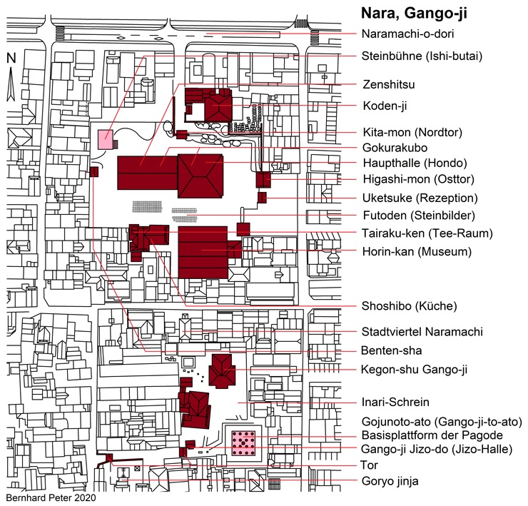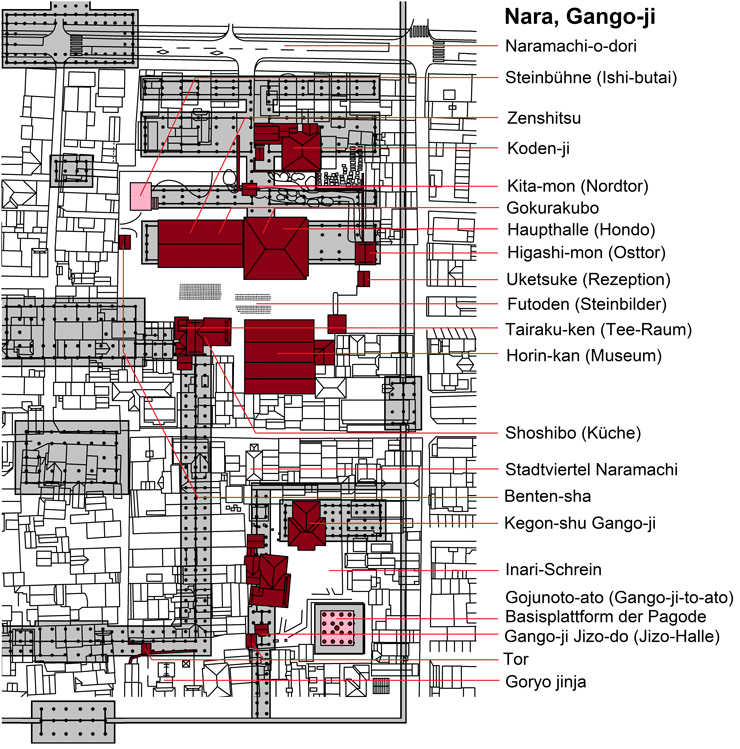 So etwa lag der Nara-zeitliche Gango-ji (graue Flächen) unter dem heutigen Viertel Naramachi und dem heutigen, zweigeteilten Tempel Gango-ji (dunkelrote Flächen). Die Eckpunkte für die ungefähre Veranschaulichung sind einerseits die Pagodenplattform (rosa, unten rechts) und andererseits die Tatsache, daß im Gokurakubo das östliche Mönchsquartier steckt. Alles andere ist unter der modernen Bebauung verschwunden. Die Basis der ungefähren Rekonstruktion ist die Zeichnung in: Minoru Ooka: Temples of Nara and Their Art, Heibonsha Survey of Japanese Art, Verlag: Art Media Resources 1973.