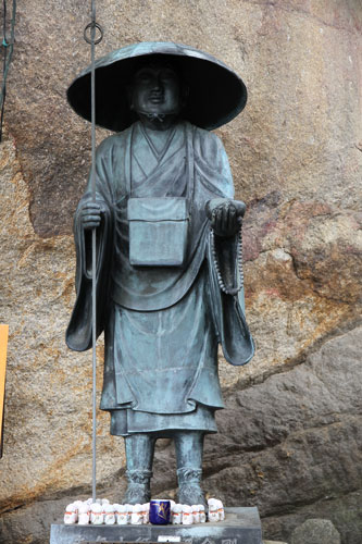 Links: Kobo Daishi Kukai. Rechts: Torii mit Aufstieg zum Senko-ji-goen.