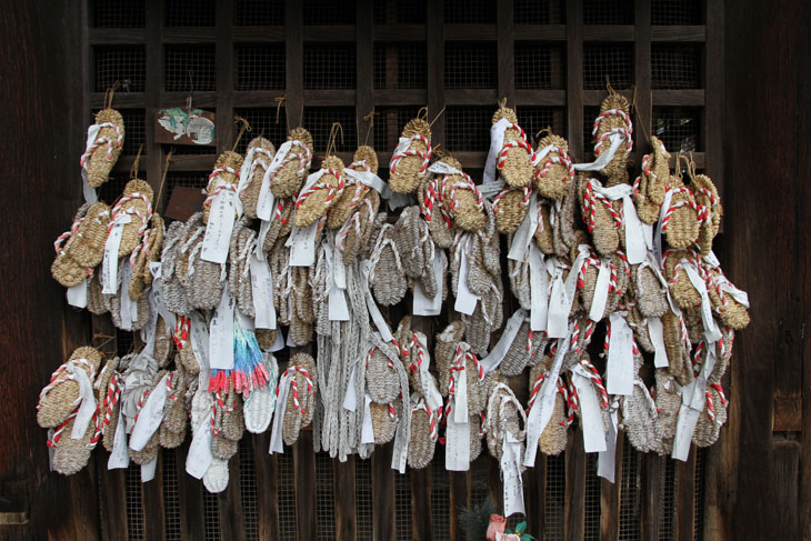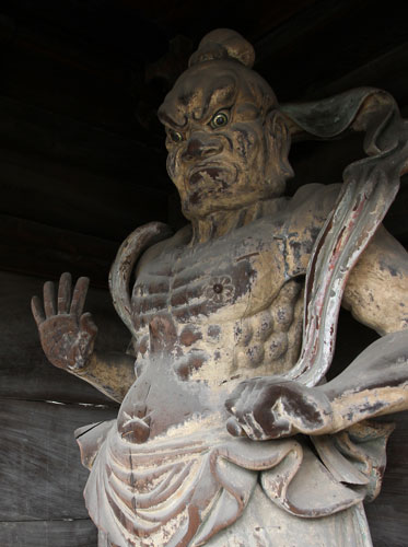 Der Zugang erfolgt nach einer kurzen Treppe über das größte Tempeltor in der Altstadt von Onomichi im Süden der am Hang in mehreren Ebenen gestaffelten Anlage. Es ist ein zweistöckiges Niomon, ein Tor mit Durchgang in der Mitte und zwei Seitenkompartimenten mit Tempelwächterfiguren darin. An dem Tempeltor aus Holz sind außen gigantisch überdimensionierte Sandalen (Waraji) aus Stroh befestigt. Sie messen ca. 2 m in der Höhe. Auf jeder Seite rechts und links des Durchganges sind drei Sandalen aufgehängt, eine ganz riesige zwischen zwei etwas weniger riesigen. Wenn man hier betet, wird einem sicher der weitere Fußmarsch leichter fallen, und für gesunde Beine sollte man auch hier beten. Darunter hängt noch eine Reihe normal dimensionierter Strohsandalen, mit Zetteln versehene Votivgaben. In den beiden Seitenkompartimenten hinter dem mit Strohsandalen behangenen Gitter wachen zwei Deva-Könige (Nio).