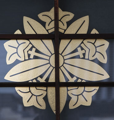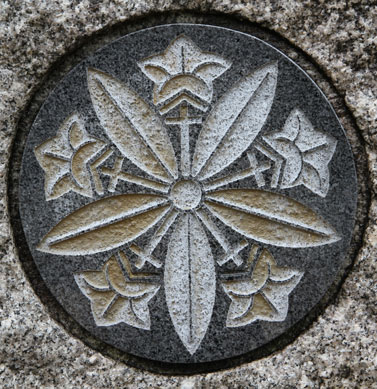 Saiho-ji, Kamon des Tempels in Stein und auf Glas