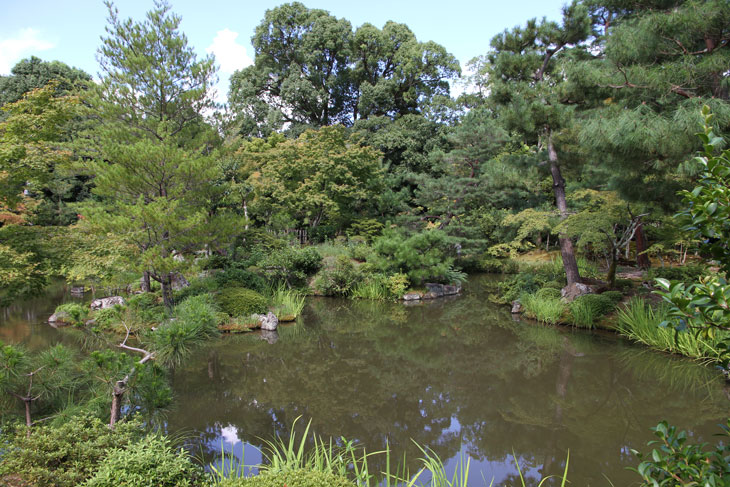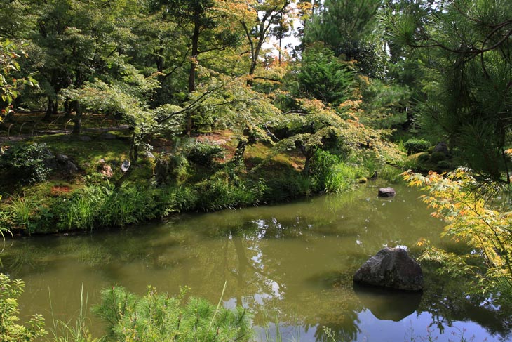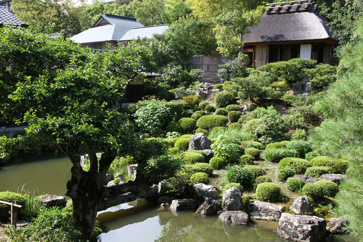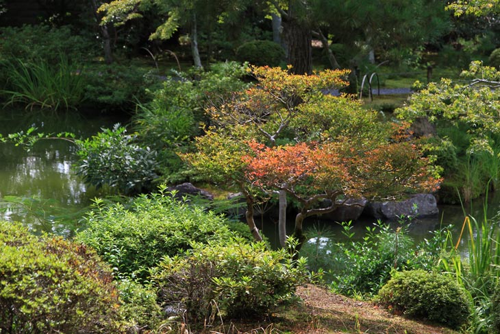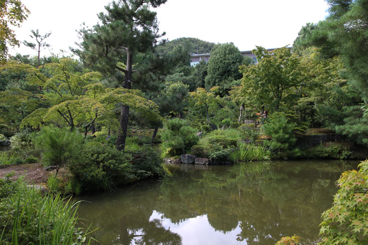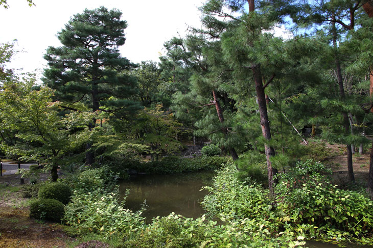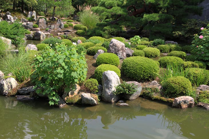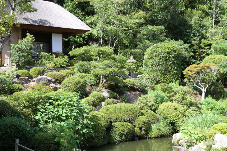 Der überwiegende Teil der Fläche wird vom Garten eingenommen, dessen beherrschendes Element zwei Teiche sind. Der Garten besteht aus zwei Bereichen: Im Westen liegt der "Fuyo-chi" mit dem kleineren Teich in Lotusblüten-Form und zierlicheren und stark kugelig beschnittenen Wuchsformen, mit vielen Steinsetzungen und Blütenpflanzen, Azaleen und Kamelien, mit zwei Steinbrücken zur Insel. Diesen Teil kann man wunderbar genießen von dem westlich des Gartens in Nord-Süd-Richtung stehenden Tatamiraum mit roten Decken, von dem man den optimalen Blick auf die Komposition hat. Im Osten liegt der "Shinji-ike" mit dem größeren Teich und herrlichem altem, großem Baumbestand und großartiger landschaftlicher Tiefenwirkung trotz der relativ geringen Ausdehnung. Der Name "Shinji-ike" kommt daher, daß der Teich (chi, ike) die Form des chinesischen Schriftzeichens "kokoro" besitzt, das "Geist" oder auch "Herz", "Seele" bedeutet und welches auch "Shin" gelesen werden kann. Und "ji" bedeutet, daß es die Form des Schriftzeichens hat, also "Shin-ji-ike" = "Herz-Zeichen(form)-Teich". Auf der Insel des größeren Teichs stand einmal der Myou-on-kaku (Pavillon der wundervollen Klänge); von diesem Pavillon haben sich nur noch Grundmauern erhalten.
