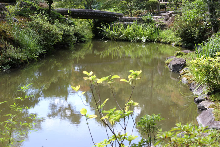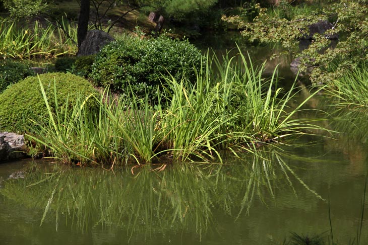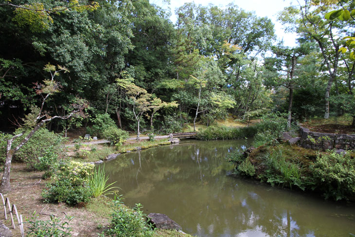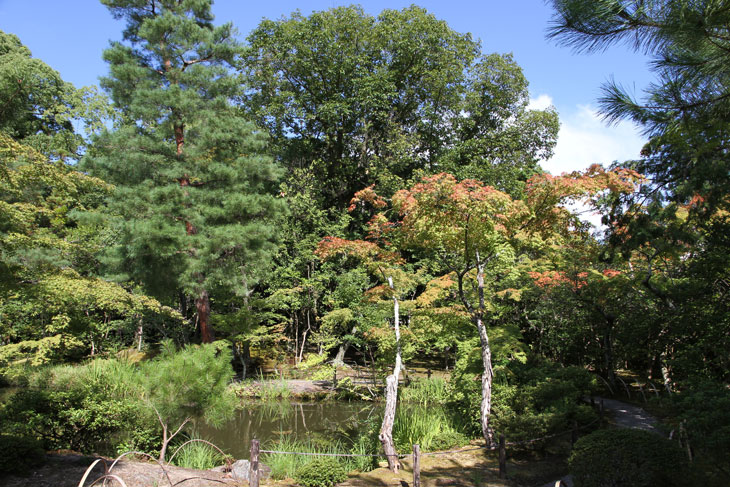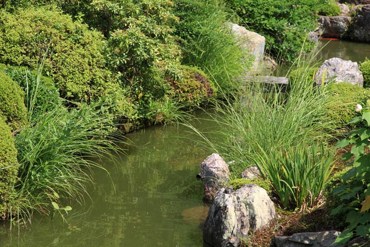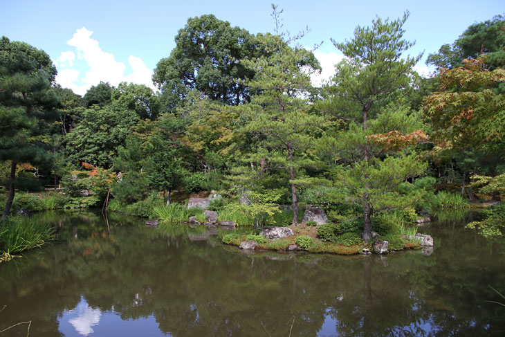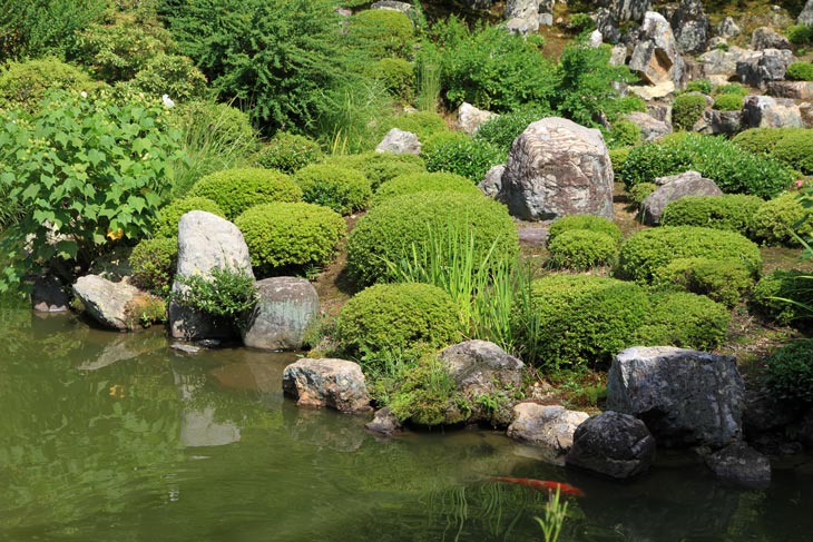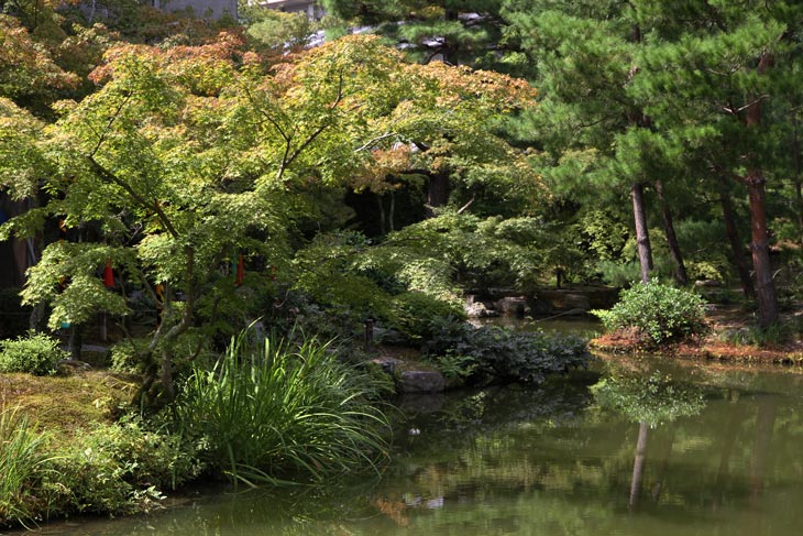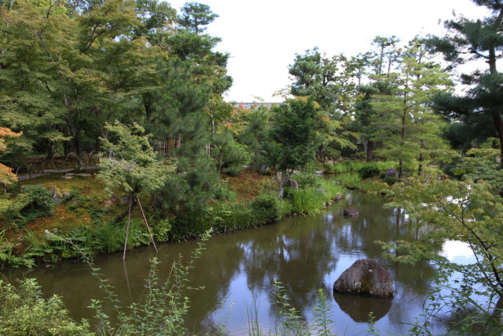 Der überwiegende Teil der Fläche wird vom Garten eingenommen, dessen beherrschendes Element zwei Teiche sind. Der Garten besteht aus zwei Bereichen: Im Westen liegt der "Fuyo-chi" mit dem kleineren Teich in Lotusblüten-Form und zierlicheren und stark kugelig beschnittenen Wuchsformen, mit vielen Steinsetzungen und Blütenpflanzen, Azaleen und Kamelien, mit zwei Steinbrücken zur Insel. Diesen Teil kann man wunderbar genießen von dem westlich des Gartens in Nord-Süd-Richtung stehenden Tatamiraum mit roten Decken, von dem man den optimalen Blick auf die Komposition hat. Im Osten liegt der "Shinji-ike" mit dem größeren Teich und herrlichem altem, großem Baumbestand und großartiger landschaftlicher Tiefenwirkung trotz der relativ geringen Ausdehnung. Der Name "Shinji-ike" kommt daher, daß der Teich (chi, ike) die Form des chinesischen Schriftzeichens "kokoro" besitzt, das "Geist" oder auch "Herz", "Seele" bedeutet und welches auch "Shin" gelesen werden kann. Und "ji" bedeutet, daß es die Form des Schriftzeichens hat, also "Shin-ji-ike" = "Herz-Zeichen(form)-Teich". Auf der Insel des größeren Teichs stand einmal der Myou-on-kaku (Pavillon der wundervollen Klänge); von diesem Pavillon haben sich nur noch Grundmauern erhalten.