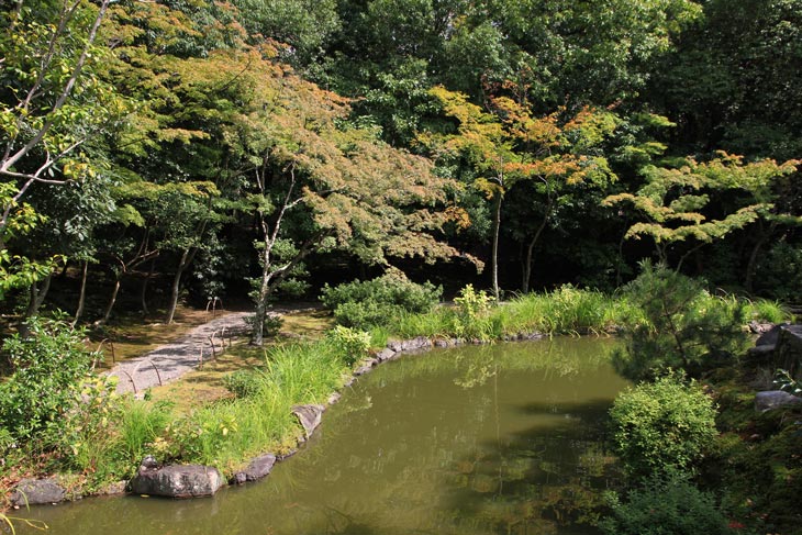 Im Gegensatz zu den Gebäuden entspricht der Garten zum überwiegenden Teil nach wie vor dem Konzept des Erbauers, Muso Soseki. Ursprünglich benutzte auch dieser Garten wie bei demjenigen des Tenryu-ji das Gestaltungsprinzip der "entliehenen Landschaft", indem der Berg Kinugasa in die Höhenstaffelung mit eingebaut wurde. Die hohen Gebäude der Ritsumeikan-Universität versperren aber heute die Sicht auf den Berg. Das Teehaus Seiren-tei liegt auf einem kleinen Hügel im Nordwesteck, dem Mondhügel (Tsuki-yama); es wurde 1457 von Shogun Ashikaga Yoshimasa (1436-1490) zum Gedenken an den 100sten Todestag von Ashikaga Takauji erbaut und ist hinsichtlich der verwendeten Materialien und der Bauweise ein typisches Beispiel für die rustikale Einfachheit, die in der Ästhetik der Teezeremonie den Wabi-sabi-Geschmack prägte. Die tiefere Ebene besitzt zwei Tatami-Matten, eine höhere Ebene ist eine Tatami-Matte groß; diese war für hochgestellte Gäste reserviert. Von diesem oberen Niveau aus hat man den besten Blick auf den Garten im Süden und - früher - auf den Berg Kinugasa im Norden.