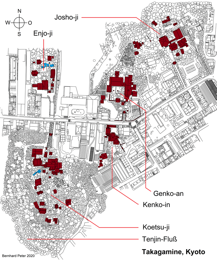 Jedenfalls lag der Bereich Takagamine, obwohl in der Nähe der Hauptstadt und trotz des schönen Ausblicks auf dieselbe, sozial außerhalb, vor allem sichtbar daran, daß es außerhalb der hauptstädtischen Jurisdiktion und vor allem außerhalb des Odoi lag, der 22,5 km langen Erdwall-Befestigung rings um Kyoto, die Toyotomi Hideyoshi hatte errichten lassen. Ein Stück davon ist noch im Südwesten von Takagamine erhalten, beim Tempel Shozen-ji im Omiya-Doi-cho. Noch ein Stück ist östlich davon im Omiya Nishiwakidaicho erhalten. In gerader Linie ging dieser Wall dann zum Kamo-Fluß, und auch dort stehen ein paar Teilstücke des Walls. Dazwischen ist der Verlauf erkennbar an parallelen Straßenzügen, die das rechteckige Raster schräg schneiden. Im Westen stieß der Wall an die Hügel, wo heute das Shozan Resort steht, auch dort ist ein Teilstück erhalten, 550 m südöstlich des heutigen Tempels. Ein weiteres Indiz für die soziale Abgeschiedenheit ist die Tatsache, daß Takagamine auf den zeitgenössischen Karten, Beschreibungen und Illustrationen der Sehenswürdigkeiten der Hauptstadt als Siedlungsbereich fehlt, es war einfach so neu, daß sich dort jemand niederließ. Die früheste Erwähnung erfolgt 1658 in einem Zweizeiler im Werk "Rakuyou-meisho-shuu", worin lediglich angegeben wird, daß Honami Koetsu dort kürzlich sein Haus erbaut hat. Das geringe Interesse der Stadtgesellschaft an der Siedlung lag auch an der völlig fehlenden Vorgeschichte und historischen Relevanz dieses Areals. Um so mehr konnte sich die entwickelnde kleine Gemeinde auf sich selbst konzentrieren und eine Selbstorganisation aufbauen und sich ganz ihren Zielen hingeben.