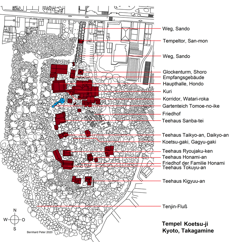 Die größte Besonderheit dieses Tempels ist die Existenz von vielen verschiedenen Teehäusern unterschiedlichen Stils. Eigentlich ist der Name Koetsu-"ji" purer Etikettenschwindel, weil die Merkmale einer Tempelanlage baulich eher im Hintergrund stehen, dafür um so prominenter eine Teehütte nach der anderen die Anlage zu einem Themenschwerpunkt Chado werden läßt. Der Koetsu-ji ist eine der wichtigsten Institutionen der Teekultur und für die Entwicklung der Teezeremonie. Das hat seine Ursache darin, daß Honami Koetsu selbst ein berühmter Meister der Teezeremonie war. Er folgte aber nicht einer bestimmten Tee-Richtung, sondern testete mal diese, mal jene Anschauung. Er übernahm nach Belieben Ideen aus verschiedenen Schulen und setzte sie auf eigene Weise um. Unter anderem pflegte er Kontakt zu den Lehrmeistern Furuta Oribe (s. o., Seppuku 1615) und Oda Urakusai. Da er bürgerlicher Herkunft war, trug er zur Verbreitung der Teekultur auch in der Händlerklasse bei.
