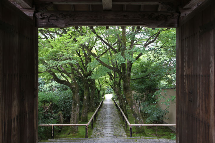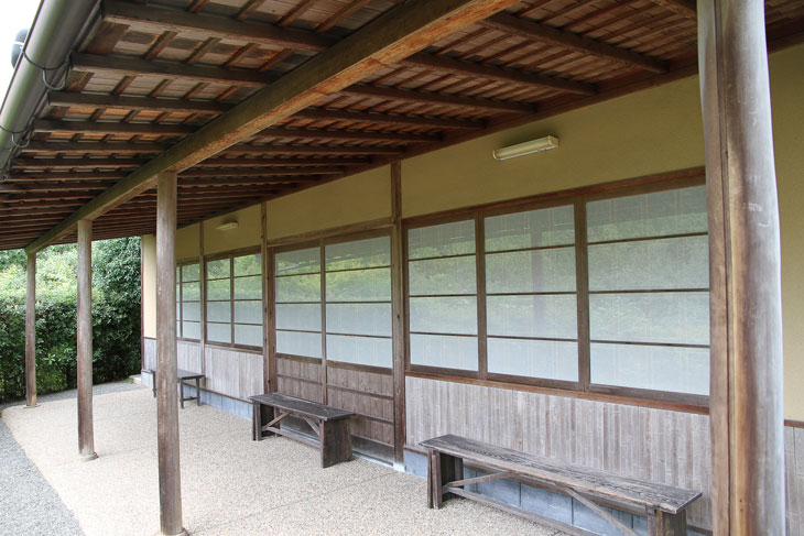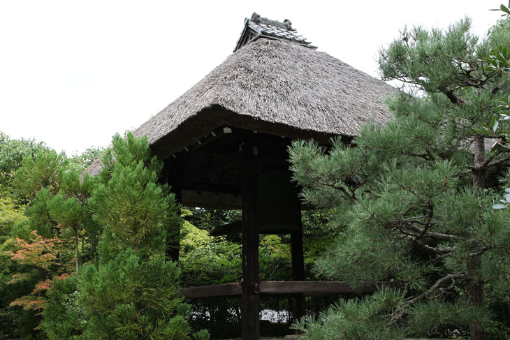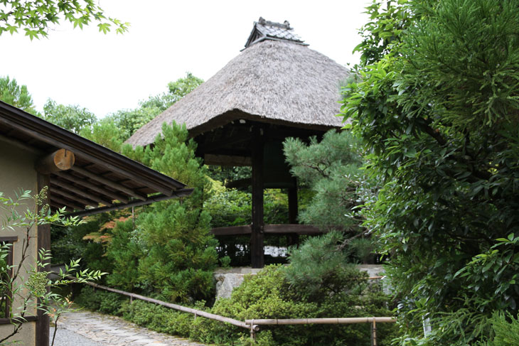 Eine kleine Weg-Abzweigung führt nach rechts zu einem leicht schräggestellten Tor vom Typ eines Korai-mon. Entlang des Hauptweges passiert man kurz darauf auf der linken Seite den Glockenturm (Shoro, Shourou), quadratisch mit einem Pyramidendach aus Schilf (Kaya-buki). Die Glocke wird Toki-no-kane genannt, Glocke der Zeit. Auf der linken Seite folgt kurz darauf das Empfangsgebäude, wo man seinen Eintrittsobulus hinterläßt (in ruhigen Zeiten auch direkt am Kuri).