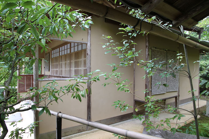 Südlich der Gebäudegruppe erstreckt sich jenseits des Gartenteiches Tomoe-no-ike (ein Tomoe ist ein abstraktes Emblem, das aus ein, zwei oder drei kommaartigen Motiven besteht) der Wandelgarten voller Teehäuser, im folgenden im Gegenuhrzeigersinn aufgelistet. Alle diese Teehäuser sind Taisho-zeitlich, also alle nach 1912 entstanden. Dennoch handelt es sich teilweise um Repliken älterer Teehäuser, und insgesamt geben sie einen hervorragenden Querschnitt über die unterschiedlichen Gestaltungsmöglichkeiten der Teehaus-Architektur.