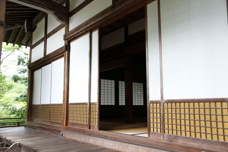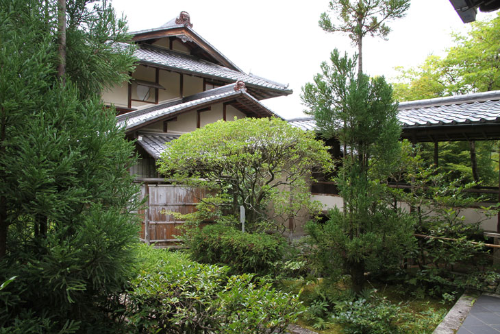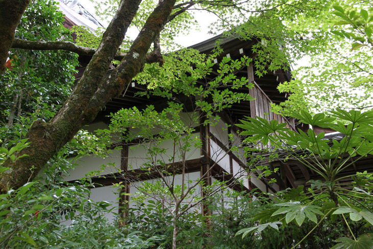 Der Weg knickt nach einem schräg verlaufenden Versatz nach rechts ab und führt zur Haupthalle (Hondo, Hondou) im Westen der Gebäudegruppe. Im Koetsu-do werden Werke und Besitztümer des Meisters Koetsu ausgestellt. An der Südostecke der Haupthalle ist ein überbrückender Korridor (Watari-roka, Watari rouka) angesetzt, der nach Osten zum Kuri (Küchenbau und persönlicher Lebensbereich der Mönche) führt. Der Weg zum Garten führt unter dem Korridor hindurch.