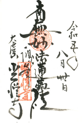 Goshuin des Koetsu-ji, mittlere Spalte typisch für Nichiren-Tempel, Namu-myoho-renge-kyo, beide rechten Spalten: Datum: Mi, 30.8.2023 = Reiwa 5 nen hachi-gatsu san-juu-nichi. Linke Spalte: Taikyo-san Koetsu-ji.