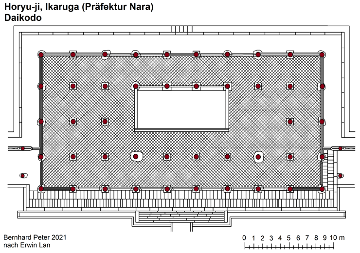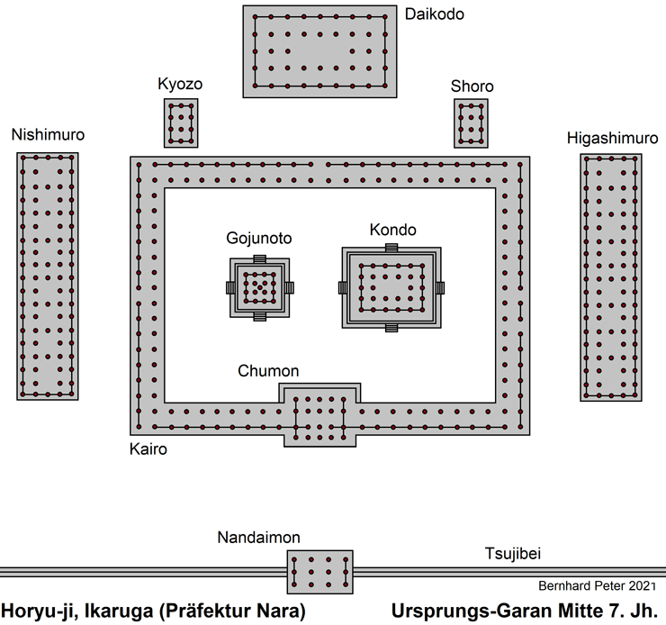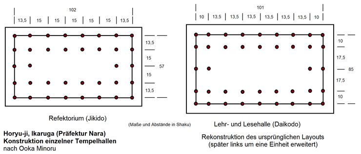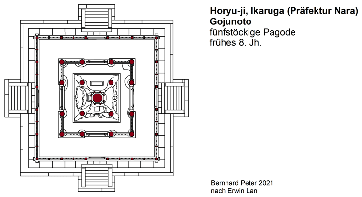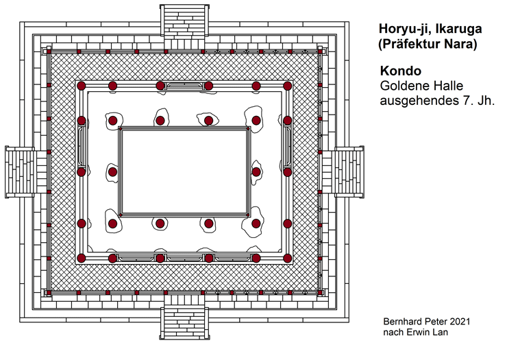 Am kompliziertesten war der gestalterische Umgang mit der Pagode, weil sie das einzige konsequent vertikale Element in der Gesamtanlage war. Im Shitenno-ji stand sie in der Symmetrieachse, ebenso im Vorläufertempel Ikaruga-dera, ebenso im Yamada-dera. Als nach dem Brand des Ikaruga-dera der Tempel als Horyu-ji wiederaufgebaut wurde, gab es entscheidende Änderungen im Grundkonzept. Denn in der Zeit vom Ende des 6. bis zum Anfang des 7. Jh. hat sich die Grundrißkonfiguration für buddhistische Tempel in Japan entscheidend geändert, und der Kudara-Plan war aus der Mode gekommen. War anfangs noch die Pagode das wichtigste Bauwerk, so wurde zunehmend die Haupthalle wichtig, um schließlich danach wichtigstes Gebäude zu werden. Der Umgang war im Horyu-ji nun querrechteckig, und die beiden wichtigsten Gebäude, Pagode und Haupthalle, wurden nicht hintereinander, sondern nebeneinander positioniert. Das entspricht der Momentaufnahme in der Architekturgeschichte, in der beide Gebäude gleich wichtig waren. Auch im Horin-ji und im Kawara-dera stellte man Pagode und Haupthalle nebeneinander. Damit ist der Horyu-ji ein Vertreter einer ganz besonderen Tempelkategorie, deren wichtigste Gebäude eine zusätzliche Querachse aufspannen.