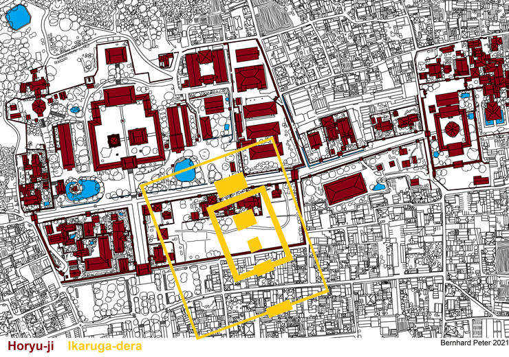 ungefährer Standort des Ikaruga-dera (gelb) im Verhältnis zum heutigen Horyu-ji (dunkelrot)