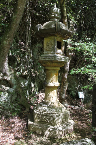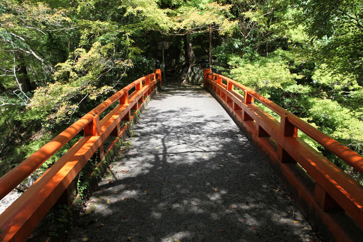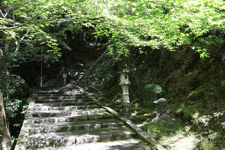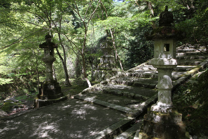 Auf der anderen Seite der Brücke führt der Treppenweg des Omote-sando (vorderer Zuweg) den Hang bis zum Tempeltor hinauf, vorbei an einer bemoosten Grabpagode. Links der vorletzten Treppe steht eine weitere Steinstele mit vier Kanji, das bedeutet "Daikaigeso" und bezeichnet eine symbolische Grenze zwischen dem Heiligtum und der Außenwelt. Wenn man nicht die Shigetsukyo-Brücke nimmt, sondern südlich der Schlucht weiter dem Weg nach Westen folgt, kommt man nach wenigen Minuten zu einer weiteren Brücke, über die man dann zum Ura-sando (hinterer Zuweg) gelangt (Kanjo-Brücke).