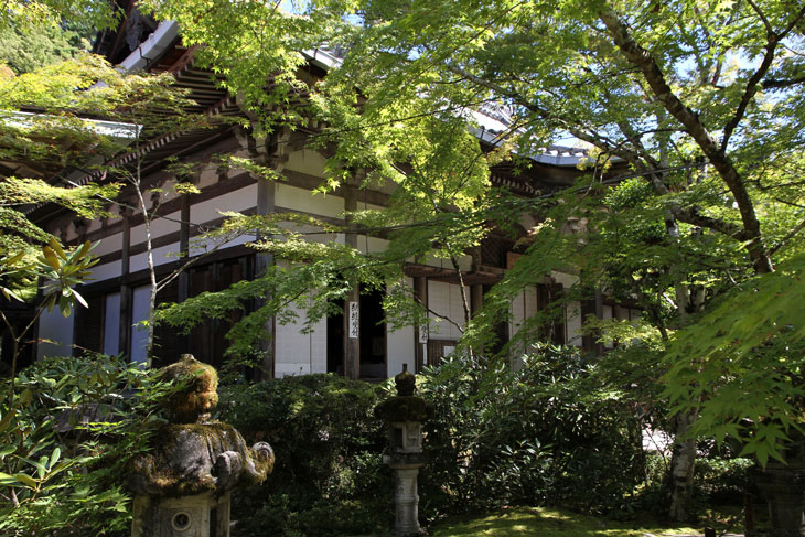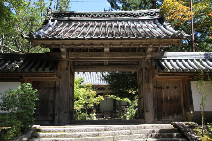 Der Zuweg endet vor dem 1700 mit Hilfe einer Spende von Keishoin erbauten Omotemon (Vordertor), vor dem unter alten Zedernbäumen mit ihren faserigen Stämmen viele Steinlaternen in Reihe stehen. Das Tor im Stil eines Yakuimon steht erhöht am Ende einer Treppe mit ausgetretenen Steinstufen und ist als Kulturgut der Stadt Kyoto eingestuft. Die angrenzenden, beiderseits mit Versatz nach vorne abknickenden Mauern stehen erhöht auf einem steinverkleideten Sockel. Neben der Hauptöffnung des Tores gibt es gleich anschließend zwei weitere hölzerne Türen in den angrenzenden Mauern. In der Nähe des Tores steht eine bemooste, fünfstöckige Steinpagode unter den Ahornbäumen. Nach dem Eingang kommt man linkerhand zum Glockenturm (Shoro) aus der Genroku-Zeit (1688-1704). Jeden Morgen und Abend wird die Glocke angeschlagen. Zum Jahreswechsel wird die Glocke an Silvester um Mitternacht 108 mal angeschlagen. Wer in der Haupthalle 100 Yen bezahlt, darf sie anschlagen. Da darf nur in wenigen Tempeln erlaubt ist: Wer schon immer mal Lust darauf hatte, so eine Glocke anzuschlagen, darf es hier tun.