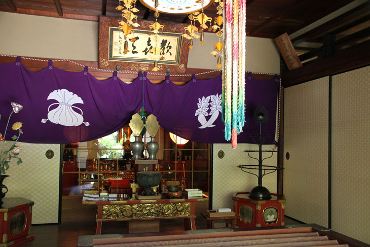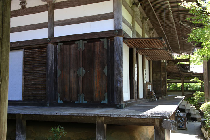 Von der Haupthalle zweigt an der Südostecke ein rechtwinklig abknickender Korridor ab, der zur Halle Shodendo (Shotendo, Verehrung von Kangi-ten) führt. Einen Hinweis auf diese Halle hatten wir bereits vor der Brücke über den Fluß gesehen. Dieser Gott Kangiten, der auch als Kanki-ten, Shou-ten (heiliger Gott), Daishou-ten (großer heiliger Gott), Daishou Kangi-ten (großer heiliger Gott der Glückseligkeit), Tenson (ehrwürdiger Gott), Kangi Jizai-ten, Shouden-sama, Vinayaka-ten, Binayaka-ten, Ganapatei und Zoubi-ten bezeichnet wird, ist die japanische Form des hinduistischen Gottes Ganesha (= Ganpati). Seine beliebteste Darstellung ist die als doppelte und sich umarmende Kangiten, als männlich-weibliches in Umarmung, und in dieser Form ist das ein Gott für die Harmonie in der Mann-Frau-Beziehung. Vor dem Eingang der Halle ist ein in der Mitte hochgeraffter Vorhang mit zwei Tempel-Kamon aufgehängt, davon eines aus zwei gekreuzten Rettiche mit Blättern oben, das andere wie ein mit einer Schnur zugebundenes Säckchen, und vor den drei Holzstufen steht ein Bronzekessel für Weihrauchstäbchen. Hier werden Glücksbringer verkauft, eine Art Verdoppelungszauber: Alles, was man gibt, wird damit doppelt zurückkommen. Die Halle wurde in der Genroku-Ära (1688-1704) erbaut. Der altmodische Verbindungskorridor zur Haupthalle eröffnet besonders schöne Blicke auf den Garten.