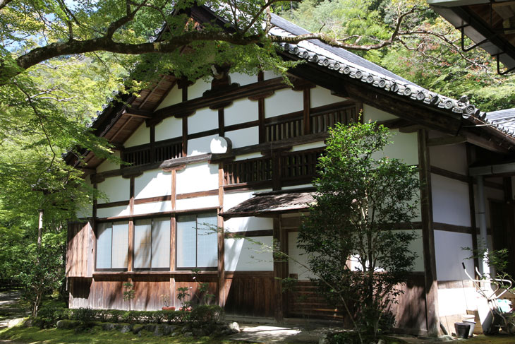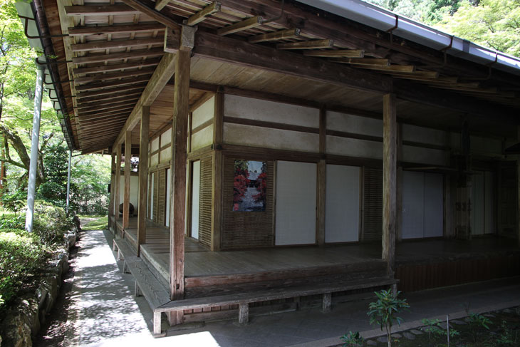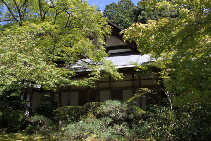 Im Westen schließen an die linke Seite der Haupthalle mit einem kurzen Gang der Kyakuden (Gästeempfangshalle, zwei Räume vorne und drei Räume hinten, älter als die Haupthalle, früh Edo-zeitlich, ehemaliges Refektorium = Jikido, um 1650 an diese Stelle umgesetzt, danach als Dojo = Trainingsraum genutzt, zwei Räume vorne, drei Räume hinten, wird im Herbst als Teestube geöffnet) und noch eine weitere Halle für die Tempelverwaltung in einer Reihe an den Hondo an. Im Osten des Hondo liegt der Garten Koke-niwa (Moosgarten). Er wird auch als fünffarbiger Garten (Go-shiki) bezeichnet. Im Garten steht eine Pagode (Houkyouin-tou).