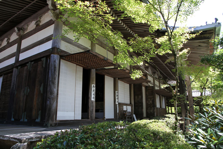 Hinter dem Tor geht es geradeaus zum besagten Hondo (Haupthalle), und das ist die einzige Halle, die man als Tourist besichtigen kann. Sie ist einstöckig und wird von einem Irimoya-Dach abgedeckt. Sie ist 7 Pfostenabstände breit und 4 Pfostenabstände tief und besteht vollständig aus Zelkovenholz. Der Grundriß ist 12,7 m breit und 7,3 m tief. Keishoin, die Mutter von Tokugawa Tsunayoshi (5. Shogun der Edo-Zeit), ließ die Halle im Jahr 1700 neu erbauen. Die Halle ist als Kulturgut der Stadt Kyoto eingestuft. Über dem Eingang hängt eine Tafel mit einer Kalligraphie von Kuukai. Innen ist die Halle durch Balkenreihen in drei Räume aufgeteilt, ein mittleres breites Heiligtum und zwei seitliche schmale Heiligtümer, eine seltene Konstruktion. Vier Säulen im mittleren Raum umgeben im Mittelraum das Figurenpodest (Shumidan dais) im chinesischen Stil. Die harmonische Einrichtung, der historische Figurenbestand und die angenehme Stimmung in der Halle überzeugen. Einige der hölzernen Statuen auf dem Shumidan haben den Rang eines wichtigen Kulturguts. In der Mitte steht als Honzon (Hauptkultbild) Buddha Shakyamuni, ein 52 cm hohes Kamakura-zeitliches Werk von Unkei und wichtiges Kulturgut. Auf beiden Türen des Zushi (Schrein für die Statue) sind Manjushri Bodhisattva und Fugen Bodhisattva abgebildet, die zusammen mit dem Hauptbild die Shakyamuni-Triade bilden. Zum historischen Statuenbestand dieses Tempels gehören noch eine 1,75 m hohe Heian-zeitliche tausendarmige Kannon (Senju-Kanzeon Bosatsu, wichtiges Kulturgut) mit elf Gesichtern und 42 Armen, gefertigt aus zusammengesetzten Zypressenholzblöcken und aufgestellt im östlichen seitlichen Heiligtum der Haupthalle, und eine spät-Kamakura-zeitliche Figur von Aizen-Myou-ou (Ragaraja) mit drei Augen, mit geöffnetem Mund, mit einem Bogen und anderen Ritualwerkzeugen in seinen sechs Händen, ebenfalls in dem seitlichen, östlichen Heiligtum der Haupthalle aufgestellt.