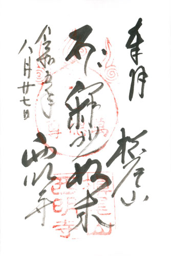 Goshuin des Tempel Saimyo-ji, Mittelspalte: Shaka Nyorai, am Anfang steht noch zusätzlich das Sanskrit-Zeichen für "Baku", linke Doppelspalte oben: Datum: So, 27.8.2023 = Reiwa 5 nen hachi-gatsu ni-juu-shichi-nichi.