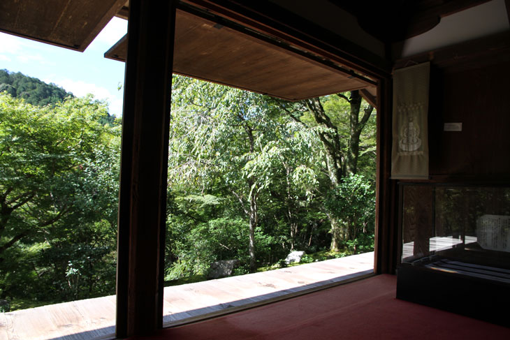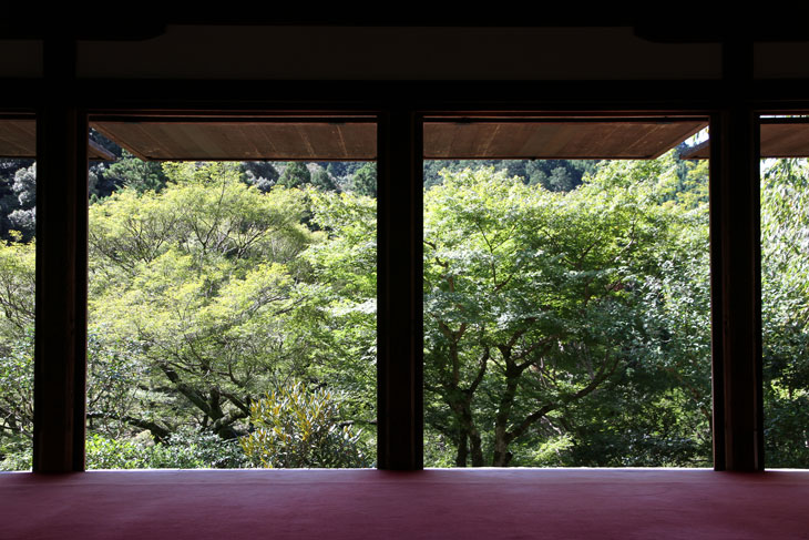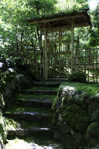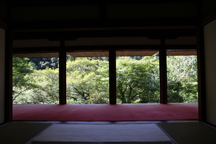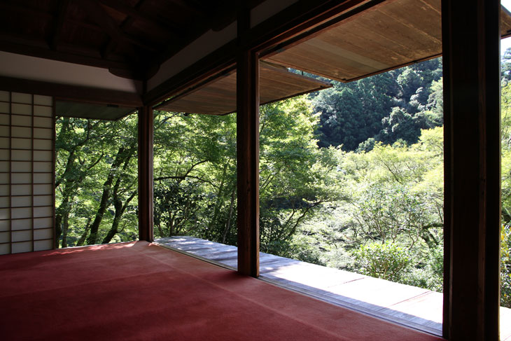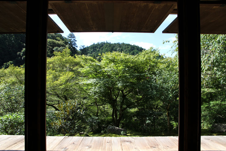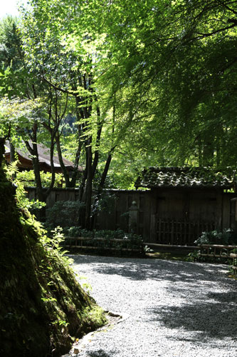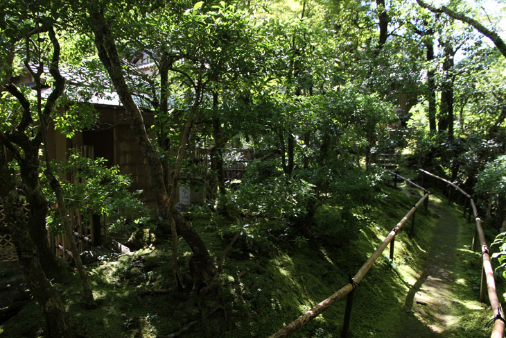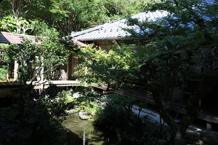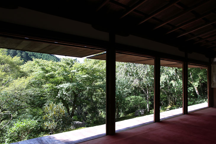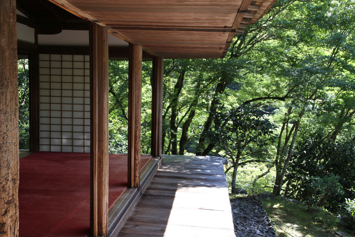 Dennoch läßt einen der Besuch unzufrieden zurück, denn man zahlt hier 1000 Yen Eintritt und bekommt im Grunde nur eine einzige Halle zu sehen, die ganz von einer einzigen Aussichtsterrasse an der Südseite lebt, mehr bekommt man nicht zu sehen. Der persönliche Lebensbereich der Bewohner, der nördlich des Kyakuden liegende Kuri, ist natürlich tabu, ebenso die dahinter liegende Trainingshalle Hokodai-dojo, dagegen ist auch nichts zu sagen; das interessante Teehaus ist aber unzugänglich, der Weg dahin ist abgesperrt, ein näheres Betrachten war nicht möglich, weil das umgebene Gebüsch und die Bäume so hoch sind, daß man im Grunde kaum etwas sieht, geschweige denn phtographieren kann. Ein Blick hinein in das Teehaus wäre sicher auch sehr interessant, aber nein, abgesperrt, nicht zugänglich. Die anderen Hallen sind auch ohne Eintritt von außen zu besichtigen, und nur von außen. Man zahlt also 7 bis 8 für eine einzige Halle, um genau zu sein für eine einzige mit Aussicht in das füllige zarte Grün und auf den gegenüberliegenden Hügel.
