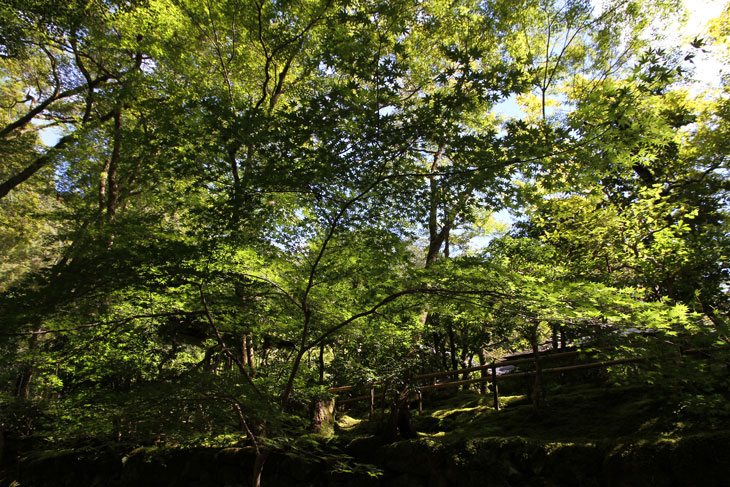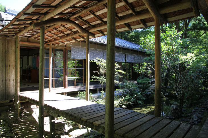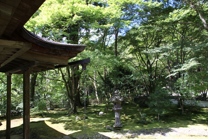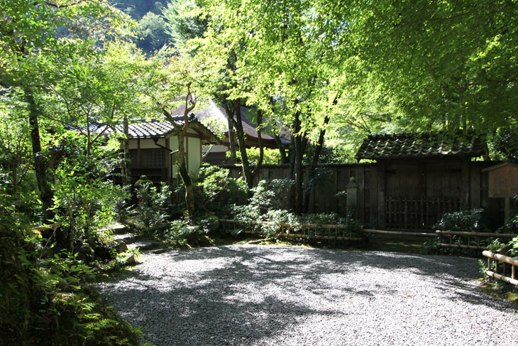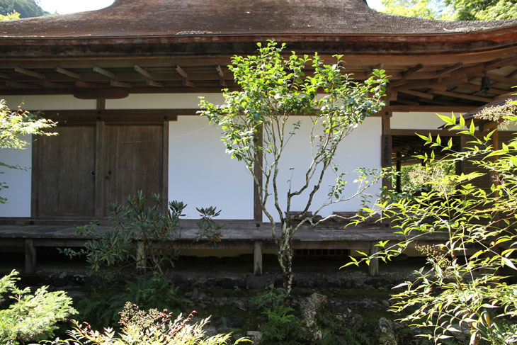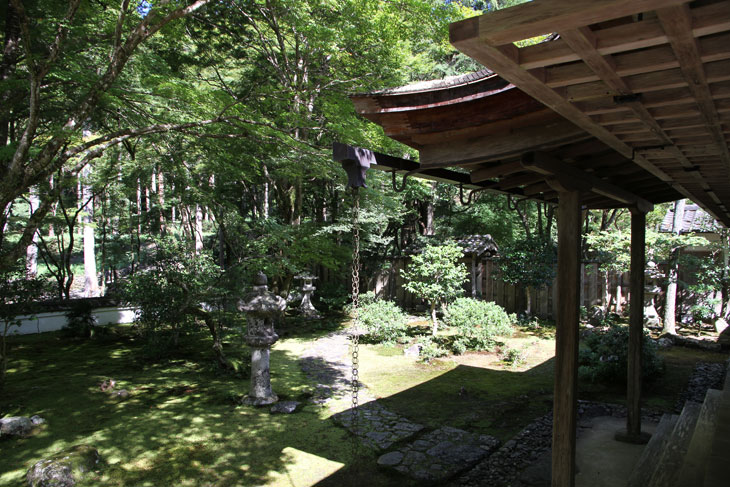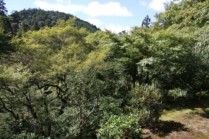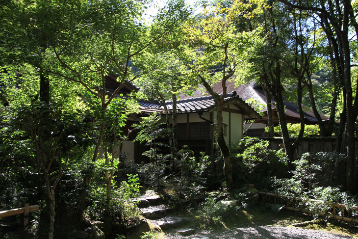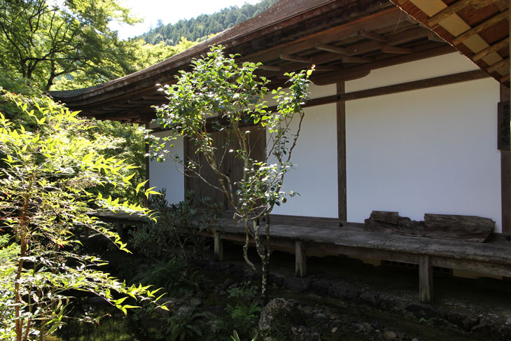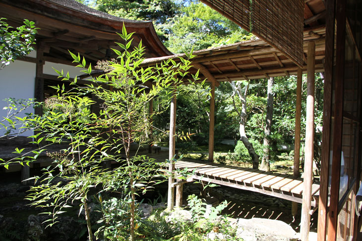 Dennoch läßt einen der Besuch unzufrieden zurück, denn man zahlt hier 1000 Yen Eintritt und bekommt im Grunde nur eine einzige Halle zu sehen, die ganz von einer einzigen Aussichtsterrasse an der Südseite lebt, mehr bekommt man nicht zu sehen. Der persönliche Lebensbereich der Bewohner, der nördlich des Kyakuden liegende Kuri, ist natürlich tabu, ebenso die dahinter liegende Trainingshalle Hokodai-dojo, dagegen ist auch nichts zu sagen; das interessante Teehaus ist aber unzugänglich, der Weg dahin ist abgesperrt, ein näheres Betrachten war nicht möglich, weil das umgebene Gebüsch und die Bäume so hoch sind, daß man im Grunde kaum etwas sieht, geschweige denn phtographieren kann. Ein Blick hinein in das Teehaus wäre sicher auch sehr interessant, aber nein, abgesperrt, nicht zugänglich. Die anderen Hallen sind auch ohne Eintritt von außen zu besichtigen, und nur von außen. Man zahlt also 7 bis 8 für eine einzige Halle, um genau zu sein für eine einzige mit Aussicht in das füllige zarte Grün und auf den gegenüberliegenden Hügel.