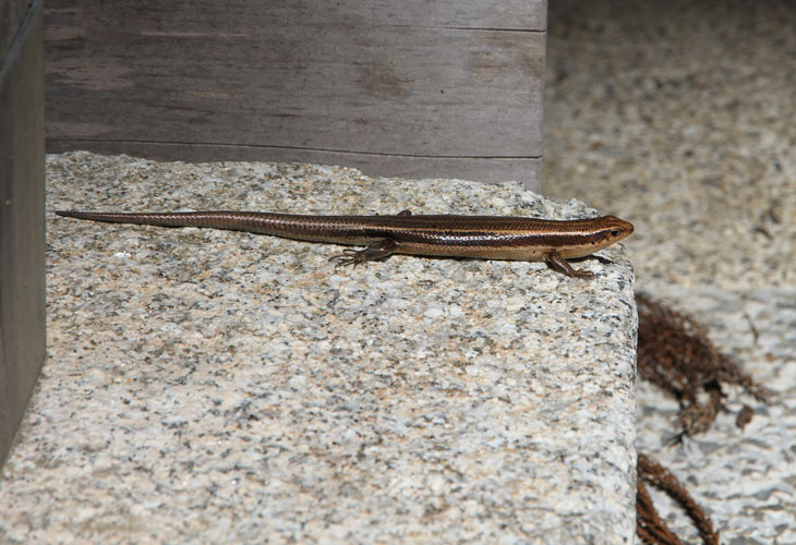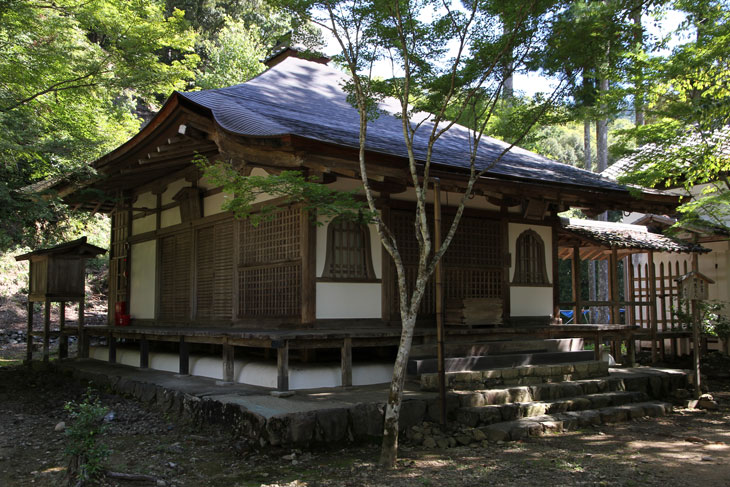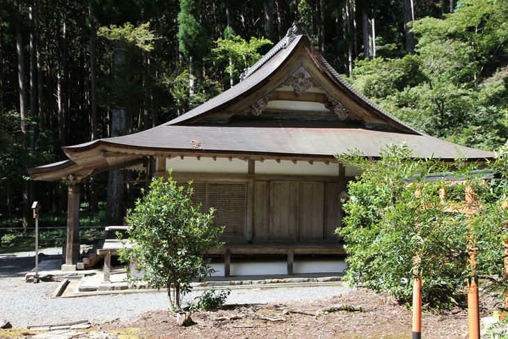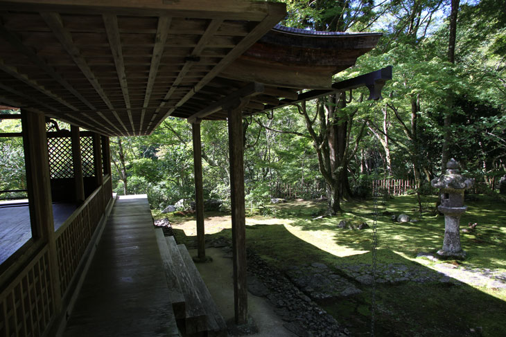 Dann kommt man zum Eingangstor, das durch die umgebende Mauer in den einzig zugänglichen inneren Bereich des Tempels führt. Hier kommt man nach Passieren des Ticketverkaufs im Kyakuden (Empfangsgebäude) über einen auf beiden Seiten offenen, von einem kleinen Garten und einem Teich begleiteten Verbindungskorridor zum Sekisui-in (seki = Felsen, sui = Wasser, Quelle), der besten Halle des Tempels, die durch ihre Eleganz besticht. Sie wird auch Gosho-do genannt. Früher stand die ca. 1206-1218 erbaute Halle im Norden der Tempelanlage, wo noch Fundamentreste zu sehen sind, und erst im Jahre 1889 wurde sie an den gegenwärtigen Platz an der Südseite versetzt. Dieser aus der frühen Kamakura-Zeit stammende Sekisui-in ist als Nationalschatz klassifiziert. Die einstöckige und mit einem Irimoya-Dach gedeckte Halle im Stil Shinden-zukuri ist einstöckig und basiert auf einer 3 (vorne) bzw. 4 (hinten) x 3 Pfostenzwischenraum-Konstruktion. An der Front ist ein 1 ken tiefes Hisashi vorgebaut. Der Eingang befindet sich auf der Giebelseite des Daches. Das Dach ist mit Zypressenholz-Schindeln (Hinoki) gedeckt. Dem Sekisui-in sieht man an, daß das Gebäude mehrere Umbauten und Umnutzungen erfahren hatte. Ursprünglich war das einmal eine Sutra-Halle, aber jetzt ist der Stil mehr Shinden-zukuri. Und vermutlich wurde die Halle nicht für diesen Tempel entworfen, sondern war eine abgelegte Palast-Halle des Kaisers und kam als Geschenk an den Tempel. Der Zustand ist also nur cum grano salis noch mit der Kamakura-Zeit in Verbindung zu bringen.