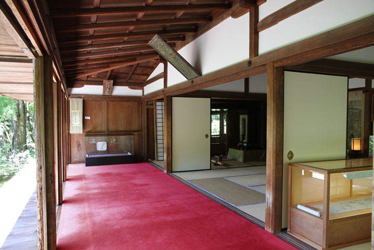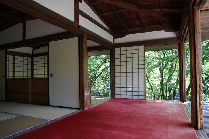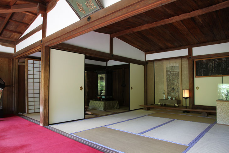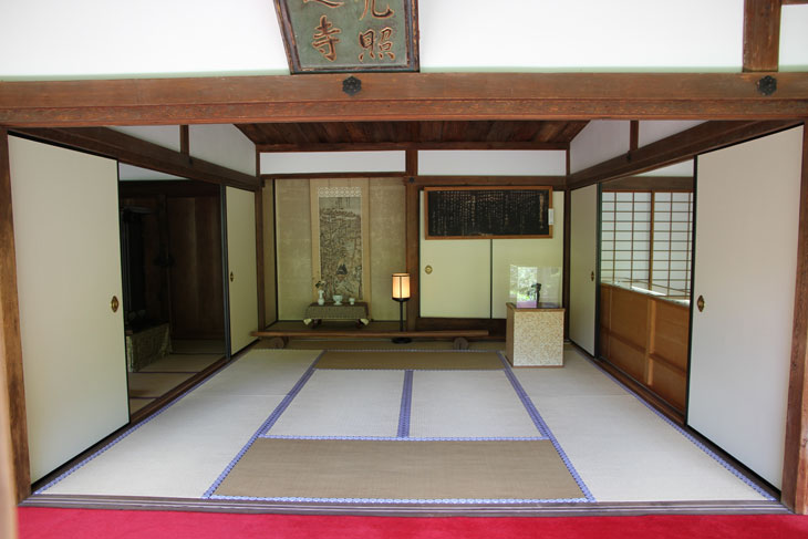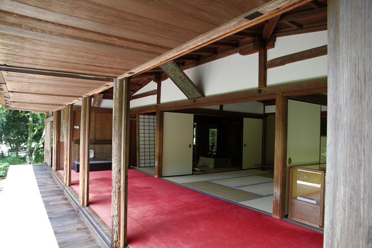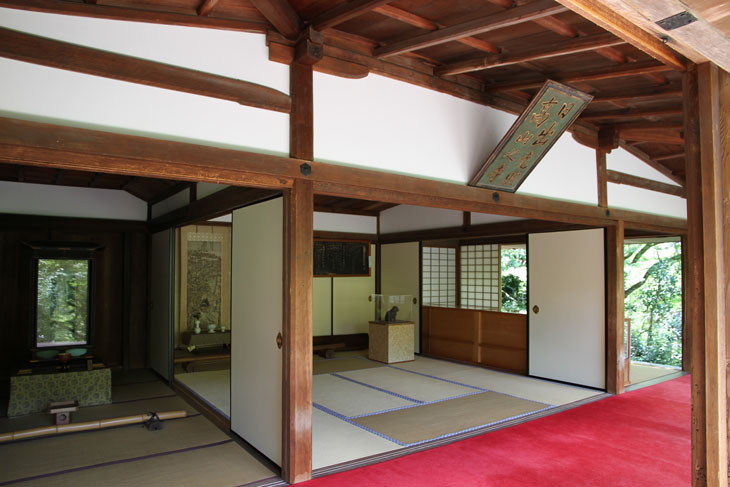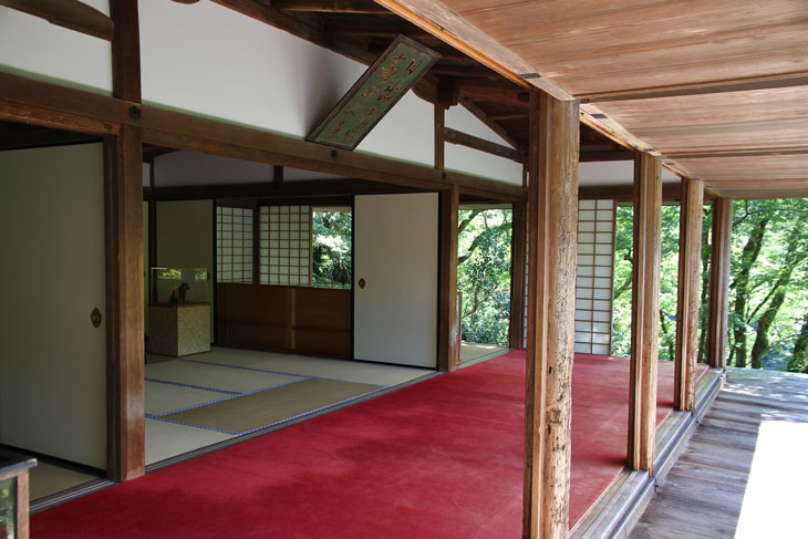 Der andere Bereich der Innenräume des Sekisui-in ist mit Tatamis ausgelegt, teilweise auch mit einem leuchtend roten Teppich. Von der Veranda auf der Südseite aus hat man einen phantastischen Blick in die Baumkronen und den Berg Mukai-yama im Hintergrund (Prinzip der geliehenen Landschaft). Die Verschlußläden der Veranda sind 90° nach oben geklappt und schirmen das helle Licht des Himmels ab. Über der Veranda ist an der Gebäudewand schräg unter dem Dach eine Schrifttafel (Kaiser-Plakette) angebracht, dessen zwei Spalten von rechts nach links zu lesen sind und "Hi-iidete-mazu-terasu-Kouzan-no-tera" lauten; das steht in Zusammenhang mit der Initiierung des Tempelbaus durch Kaiser Go-Toba und ist der von Myoue gewählte Tempelname, der sich auf eine Zeile in einer Sutra bezieht (Buddhavatamsaka-Sutra = Avatamsaka-Sutra): Wenn die Sonne aufgeht, werden die höchsten Gipfel der Berge als erstes angeleuchtet. In der Sutra ist der Wortlaut "Hi idete mazu takaki yama o terasu". Der Tempelname "Hi-iidete-mazu-terasu-Kouzan-no-tera" hieß soviel wie "erster Bergtempel, der von der aufgehenden Sonne zuerst beleuchtet wird". Und man sieht, daß "Kouzan-ji" nur eine Kurzform ist.