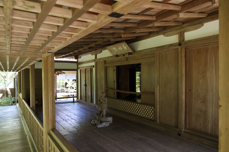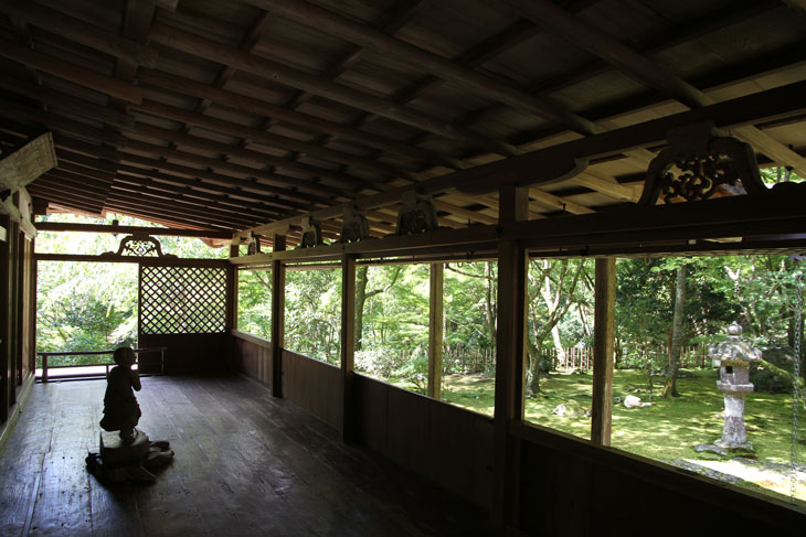Im auf der Westseite befindlichen Hisashi-no-ma, einem auf drei Seiten offenen Bereich mit Holzdielenboden, ist eine Statue von Zenzai-Doji aufgestellt, eines in frühen buddhistischen Texten beschriebenen Gläubigen, der auf seinen ausgedehnten Reisen auf der Suche nach Erleuchtung verschiedenen spirituellen Lehrern begegnet und schließlich zum Bodhisattva (Bosatsu) wird. Die Figur steht auf einer Baumscheibe mit erhobenen Händen und hat den Kopf leicht zur Seite gedreht. Der Schritt nach vorne und die wehenden Gewänder lassen die Figur wie in der Bewegung eingefroren erscheinen. Die Dekoration der Holzelemente mit filigranen Schnitzereien ist zurückhaltend, aber qualitätvoll. Ein Teil der Seitenwand des Raumes ist mit einem Diagonalgitter versehen. Durch die offenen Bereiche der Seitenwände geht der Blick in die Baumkronen.