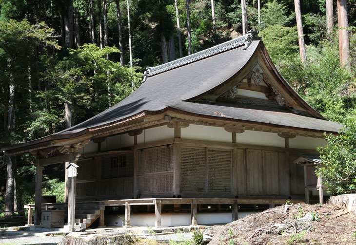 Ganz oben am Ende des Hauptweges, etwas links von allen anderen Gebäuden, liegt die dem Besucher verschlossene Haupthalle (Kondo, Kondou). In ihr wird Shaka Nyorai (Buddha Shakyamuni) als Hauptkultbild verehrt; die Figur stammt aus der Muromachi-Zeit. Ursprünglich standen der Figur noch Gakko und Nikko zur Seite, doch die wurden in der beginnenden Meiji-Zeit, als die Tempel massive Unterdrückung erfuhren, verkauft. Nikko befindet sich im Besitz des Nationalmuseums Tokyo, und Gakko gehört jetzt der Fine Arts Collection der Universität Tokyo. Das aus dem Jahr 1634 stammende und davor im Ninna-ji aufgebaute, dann hierhin versetzte Gebäude ist aber eine moderne Rekonstruktion. Im September 2018 wurde das Dach durch den Taifun 21 ("Jebi") des Jahres schwer beschädigt, dabei stürzten auch etliche alte Bäume auf dem Gelände um, die Lücken sieht man noch 5 Jahre später deutlich. Hinter der Haupthalle sehen wir eine viereckige Pagode auf einem Sockel am Waldrand; eine weitere ist in der Nähe. Beide Pagoden, sowohl der Hokyoin-to als auch der Nyohokyo-to, sind wichtige Kulturgüter. Die Schutzgottheit des Tempels wird im schlichten Kasuga-Myou-jinja verehrt. Einige Ruinen eines Steinfundamentes zeigen die Position an, wo sich anfangs die Halle Sekisui-in befunden hatte, bevor sie an die Südostseite des Geländes versetzt wurde. Unter einem kleinen Unterstand befindet sich eine Fußspur Buddhas (Bussoku-seki), ein großer flacher Findling mit zwei eingehauenen Fußumrissen, in deren Mitte noch ein doppelter Kreis eingeritzt ist (Sokugenirinsou). Eine der Sanjuunisou, der 32 unterscheidenden Merkmale eines Buddha, ist die Markierung der Fußflächen mit einem Senpukurin, dem tausendspeichigen Rad. Hier oben auf der obersten Ebene der Tempelanlage ist auch ein quadratisches Gobyou mit Pyramidendach und einem schlichten überdachten Eingangstor zu finden, das ist das Grab von Myoue-Shounin (Myoue-shounin-gobyou, Kaisan-byou). Auf einem hohen Sockel steht eine bronzene Sho-Kannon im Wald, ein modernes Werk aus dem Jahr 1961. Sie hält die Rechte segnend empor, und in der Linken hält sie das mystische Juwel.