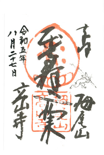 Goshuin des Kozan-ji, Mittelspalte: Shaka Nyorai, rechte Spalte unten: Datum: So, 27.8.2023 = Reiwa 5 nen hachi-gatsu ni-juu-shichi-nichi. Linke Spalte unten: Kozan-ji. Rechte Spalte unten: Bergname: Toganoo-san.