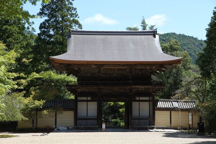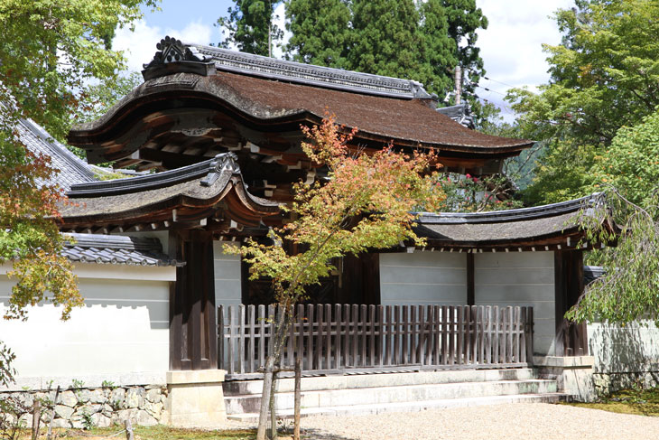 Hinter dem Tor öffnet sich eine ca. 100 m lange freie Ebene. Rechterhand, also nördlich des langgezogenen Platzes, befindet sich ein normalerweise nicht zu besichtigender Bereich, wo die Mönche leben und wo sich die Tempelverwaltung befindet, Honbo genannt. Eine Mauer mit zurückgesetztem Karamon trennt diesen Bereich ab; der First steht parallel zur Mauer; die geschwungene Linie zeigt sich an den beiden Seiten. Die Torflügel sind reich verziert mit filigranen Feldern und vergoldeten Beschlägen. Hinter dem Tor liegt ein Trockengarten aus Kiesflächen und Felsen. Der Weg zur größten Halle (Shoin) knickt zweimal rechtwinklig ab und unterstreicht die Strenge der Gartengestaltung. Etliche weitere Hallen bilden ein dichtes Konglomerat. Ein zweiter Zugang zu diesem Bereich liegt außen rechterhand noch vor dem Romon, dort kann man durch das offene Satteldachtor einen Blick in den Garten und auf die Gebäude erhaschen. Im Garten sind zwischen den üppigen Moospolstern und Azaleen-Büschen mehrere alte Oni-gawara aufgestellt, End-Ziegel der Dächer mit Dämonenfratzen. Im Herbst gibt es Sonderöffnungszeiten für den Shoin, normalerweise ist hier aber zu.