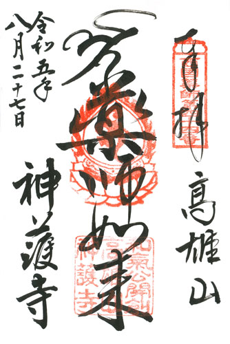 Goshuin des Tempel Jingo-ji, Mittelspalte: Yakushi Nyorai, linke Doppelspalte oben: Datum: So, 27.8.2023 = Reiwa 5 nen hachi-gatsu ni-juu-shichi-nichi. Linke Spalte unten: Jingo-ji. Rechte Spalte: Bergname: Takao-san.