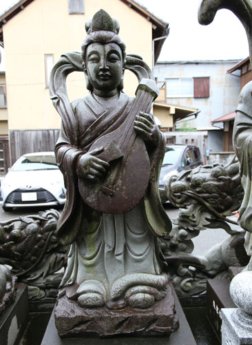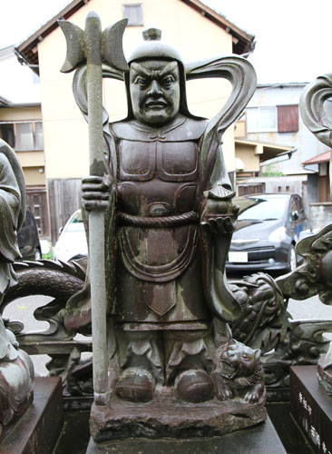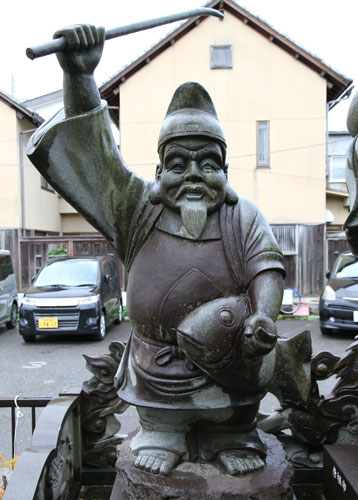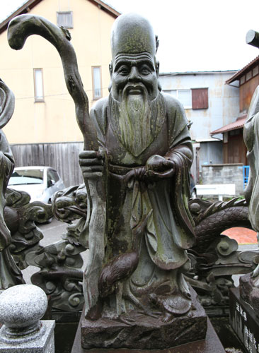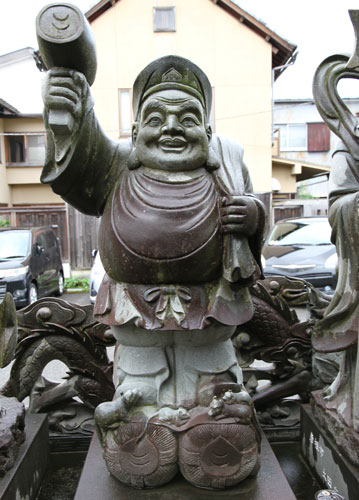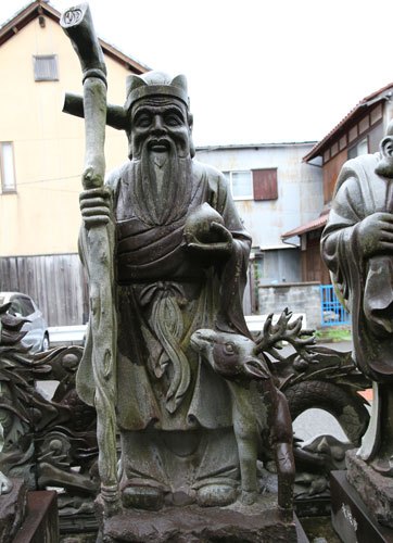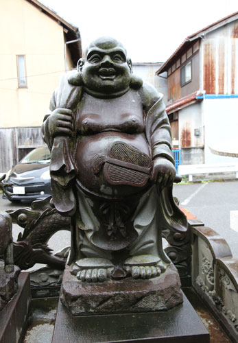 Man kann dem kleinen Weg links an der Haupthalle vorbei zur Grundstücksgrenze folgen, dort stehen aufgereiht Statuen der sieben Glücksgötter (Shichi-fuku-jin). Das ist eine der wenigen Stellen, an denen man alle sieben auf einmal hat. Hinter diesen Statuen liegt schon der Parkplatz der Nachbarparzelle, alles ist hier sehr eng.