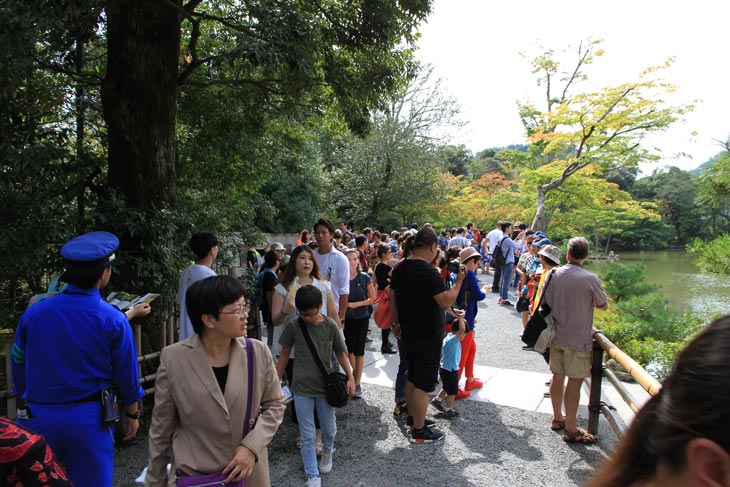 2015 gab es 19,73 Millionen Touristen in Japan, 47,1 % mehr als 2014. Davon waren 5 Millionen Chinesen. Tendenz steigend. Und nahezu jeder Tourist besucht den Kinkaku-ji, weil er weltweit als die wichtigste Sehenswürdigkeit Kyotos gilt. Selbst wer nur einen einzigen Tag in Kyoto verbringt, besucht ihn in der Regel. Man kann sich leicht ausmalen, was diese Situation aus einem einstig religiös-spirituell geprägten Ort macht: Er wird zur Kulisse degradiert. Viele Besucher leihen sich bei örtlichen Verleihfirmen traditionelle Kleidung, um sich genau so vor den Hauptsehenswürdigkeiten per Selfie abzulichten (und mit dem Selfie-Stick dabei 10 andere Menschen zu erdolchen); eine religiöse Stätte wird so zur bloßen Kulisse für den Egozentrismus (warum sonst genießt man die Szene, indem man mit dem Rücken zum Pavillon steht?). Es würde völlig ausreichen, irgendwo in Bahnhofsnähe eine Leinwand mit dem Photo des Kinkaku-ji aufzustellen und die Touristen davor gegen Entgelt abzulichten; für die überwiegende Mehrheit der Besucher würde es keinen Unterschied machen. Diese Massen müssen aus den Gebäuden selbst ausgesperrt werden, weil diese sonst unter den vielen Füßen zu Staub zermahlen würden. Folglich bewegt sich die Menschenmenge an den Absperrungen entlang; ein Betreten der Gebäude kommt zum Schutz ihres Fortbestehens gar nicht mehr in Frage.