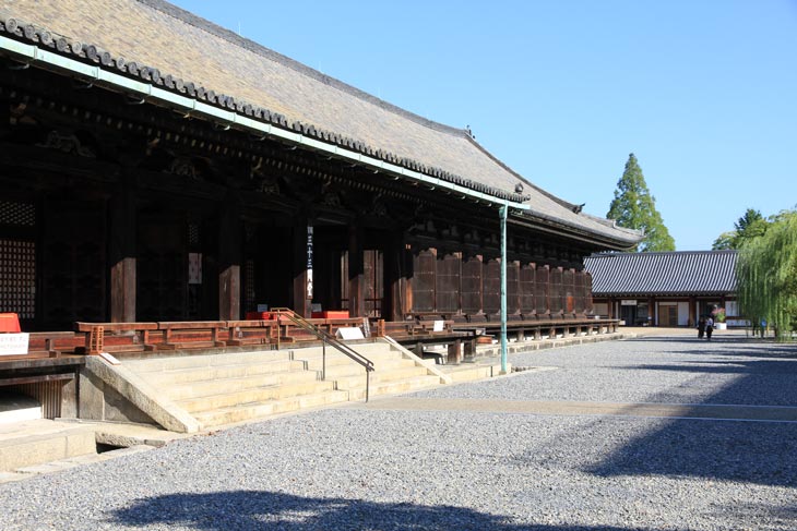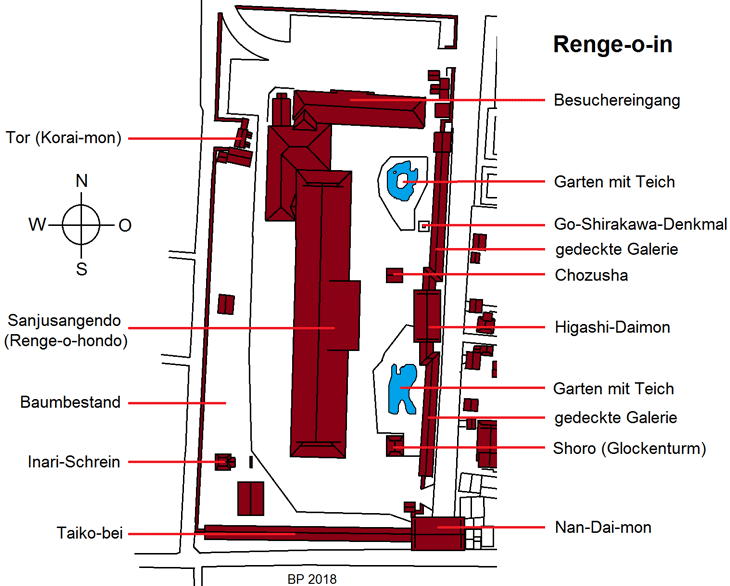 Zur Anlage: Im Luftbild der Stadt sieht man die Anlage als klares, übersichtlich geordnetes Rechteck, in Nord-Rüd-Richtung ins Straßenraster gefügt, mit der langrechteckigen Halle mittendrin, ebenfalls in Nord-Süd-Richtung aufgestellt mit der ursprünglichen Eingangsseite im Osten. Der heutige Eingang erfolgt durch das moderne Erschließungsgebäude im Norden, das den Tempelbereich als Querriegel vom Parkplatz trennt. Dieses Gebäude, in dem die ganze touristische Infrastruktur untergebracht ist, greift von Nordwesten her an die Halle, und dort betritt und verläßt man den musealen Bereich. Die Ostseite des Areals wird durch einen langen Korridor im Kamakura-zeitlichen Stil (Rekonstruktion in der Mitte des 20. Jh.) bestimmt mit einem großen Haupttor (Higashi-Daimon, "östliches großes Tor", oder To-mon, Ost-Tor) in der Mitte und einem kleinen Nebentor am nördlichen Ende der Galerie. Während die Halle selbst von schwarzbraunem Holz geprägt ist, sind Tor und Galerie zinnoberrot gestrichen mit weißen Wandflächen auf der Außenseite (Renovierung 2017 fast abgeschlossen, nur z. T. noch im Gange). Nördlich und südlich des mittig angelegten Tores befinden sich zwei Gartenanlagen, jeweils mit einem Teich. Sie wurden im Kamakura-zeitlichen Stil rekonstruiert und sind mit Kirschbäumen, Kamelien, Azaleen, Iris etc. bepflanzt. Jeweils südlich der Gartenanlagen stehen einzelne Gebäude frei im Hof; neben dem nördlichen Garten befindet sich die Chozusha zum Waschen von Händen und Mund (mit ein paar aufgestellten Steinbildern mit umgebundenem rotem Lätzchen). Neben dem südlichen Garten steht der ebenfalls zinnoberrot angestrichene Glockenturm (Shoro), dessen Glocke jeden Morgen und Abend angeschlagen wird. Der Glockenturm wurde zur Erinnerung an den 1200sten Jahrestag der Eröffnung des ersten Tempels auf dem Berg Hiei rekonstruiert. Gegenüber der Vorderseite der Halle befindet sich vor der östlichen Galerie ein schlichtes Steindenkmal, das Honen (Hounen), ein Tendai-Priester, anläßlich des 13. Todestages des Kaisers Go-Shirakawa (gestorben am 13.3.1192) errichten ließ. Auf der Westseite befindet sich entlang der hier nur schwachen Mauer ein Grüngürtel mit altem Baumbestand, in den einzelne kleine Gebäude integriert sind. In der Südostecke befindet sich hinter einem Torii ein Inari-Schrein. Dieser Schrein wird "Kuze" genannt, Weltenrettungs-Inari-Schrein. Im Norden der Westflanke befindet sich ein Tor vom Typ eines Koraimon, das zur Yamato Oji Dori hinabführt (kein Besuchereingang).