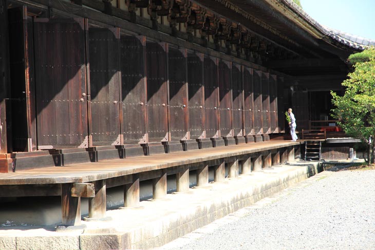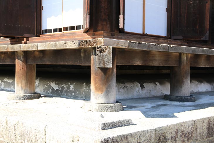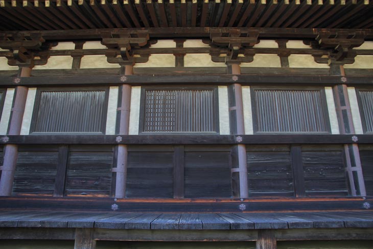 Entlang der Ostseite sind die Säulenzwischenräume mit Klappläden und Shoji-Wänden dahinter versehen.