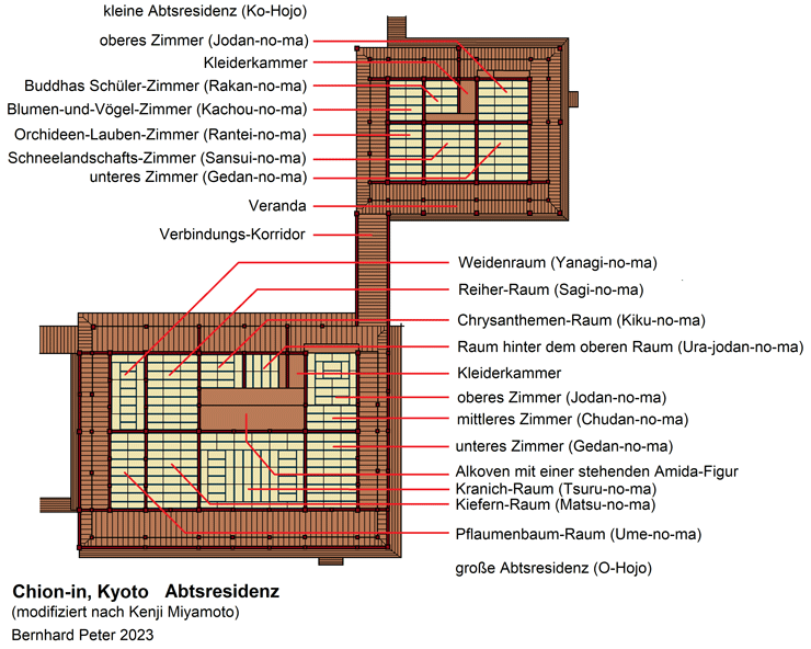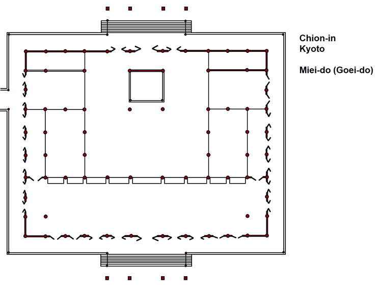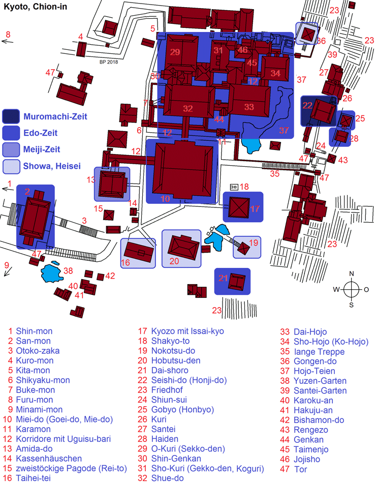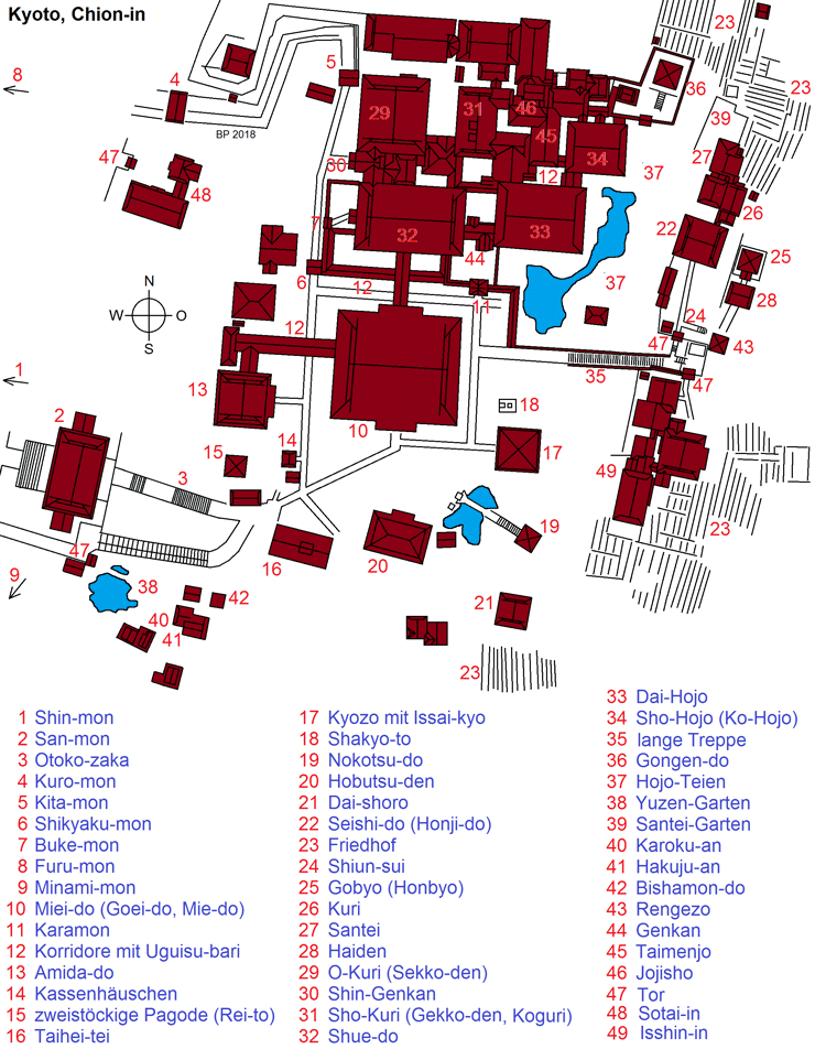 Chion-in (2): Kyozo, Seishido, Gobyo - Chion-in (3): Dai-Shoro, Amida-do, Hojo - Chion-in (4): Hojo-Garten - Chion-in (5): Yuzen-Garten - Chion-in (6): Miei-do (Goei-do) - Chion-in (7): Karamon und weitere Gebäude