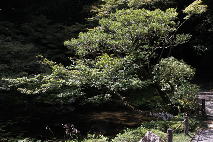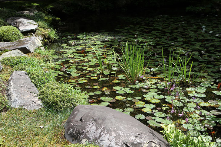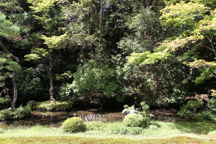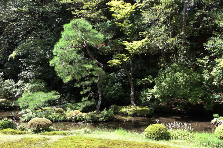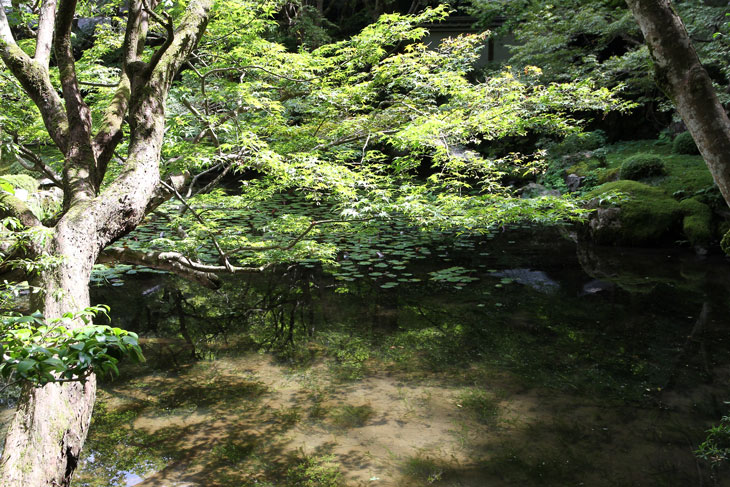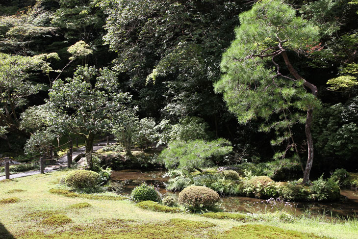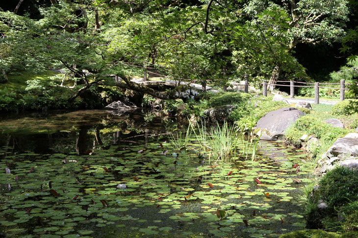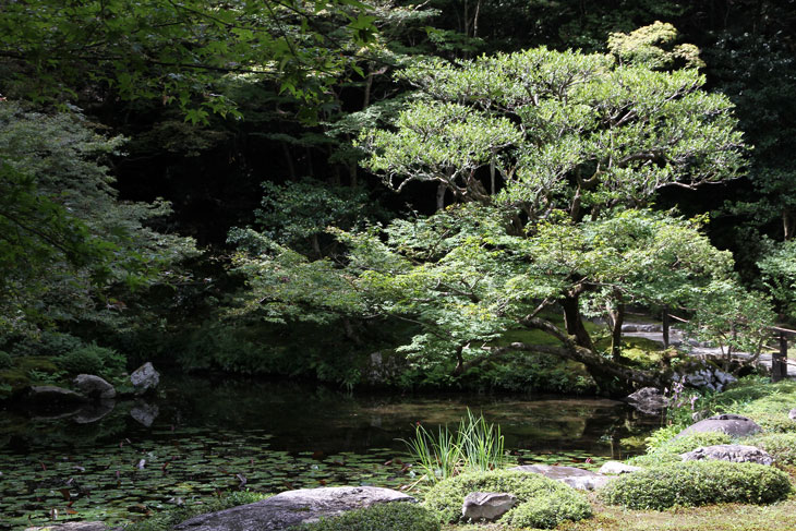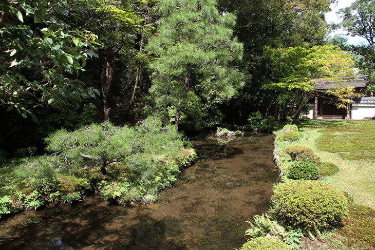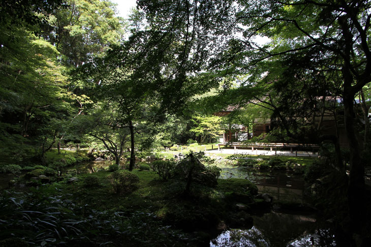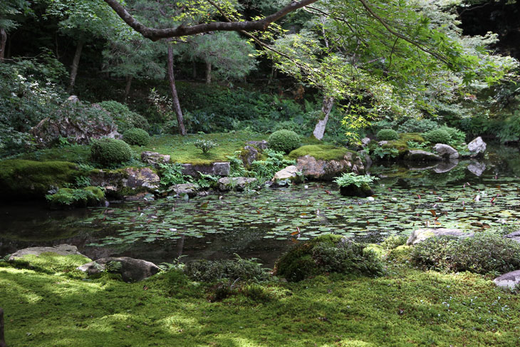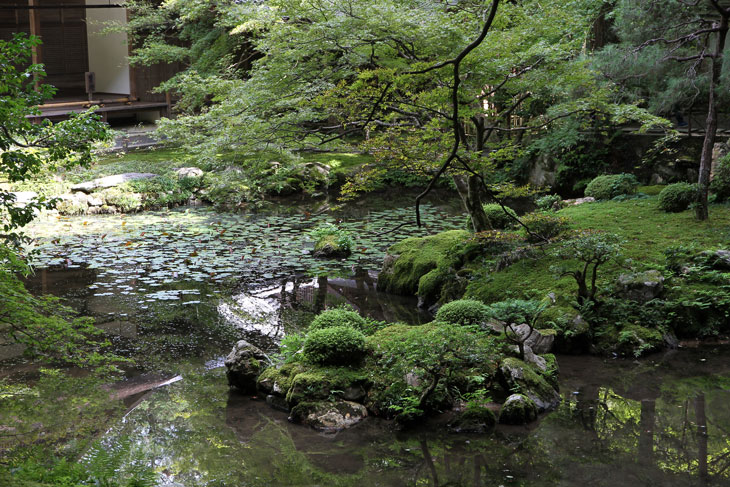 Jenseits des Aquädukts im Süden liegt der Nanzen-in (ein Tempel des Rinzai-Zen-Buddhismus) mit einem bereits im 14. Jh. angelegten Garten rund um den verwunschenen Teich Sogen-ike (Sogenchi-Teich), der von einem Wasserfall gespeist wird und einige künstliche Inseln besitzt. Geschickt ist der Tempelgarten in eine Nische des Berghanges eingebettet. Auf dem Hügel, von dem der Wasserfall kommt, steht der Glockenturm des Subtempels. Der Garten wird geprägt von dem großen See und den vielfältigen Ausblicken beim Umschreiten, ein Weg führt um den ganzen See herum. Der untere Teil des Sees zeichnet die Form des chinesischen Schriftzeichens "Herz" (Kokoro) nach. Der obere Teil des Sees ist wie ein Drache geformt und enthält eine Insel Horai. Die ursprüngliche Gestaltung wird Muso Soseki (1275-1351) zugeschrieben, andererseits wurde seitdem so viel geändert, daß wohl nichts mehr von seinen Gestaltungen wirklich noch vorhanden ist. Besonders malerisch sind bei diesem Subtempel die moosbewachsenen Dächer der Gebäude und die wunderbare Ei8nheit von Architektur und Natur. Die Irimoya-Dächer einiger Gebäude sind mit Zypressenrinde gedeckt (Hinoki-zukuri), wofür lauter kleine Rinden-Stückchen nebeneinander plaziert werden, in mehreren Lagen übereinander, mit Holznägeln an Ort und Stelle gehalten (die Technik heißt Kokera-buki). Der Nanzen-in ist der älteste der Subtempel des Nanzen-ji. Die ursprüngliche kaiserliche Villa des 13. Jh. hatte sich etwa hier befunden. Kameyama war ein Anhänger des Zen-Buddhismus und verwandelte die 1264 erbaute Villa 1291 in einen Tempel um. Deshalb existiert hier auch ein ringsum von einer Mauer umgebene Mausoleum für Kaiser Kameyama; es wird ein bißchen Asche von ihm hier aufbewahrt, und eine Statue auf dem Altar stellt ihn in priesterlicher Gewandung dar (wichtiges Kulturgut). Im Jahre 1393 gingen die Originalgebäude verloren, der Ersatz (ebenfalls eine kaiserliche Stiftung) wurde erneut im Onin-Krieg vernichtet. Der Nanzen-in wurde 1703 von "Keisho-in", der Mutter des fünften Shoguns Tokugawa Tsunayoshi wiederaufgebaut. Die Fusuma innen im Tempel sind mit schwarz-weißen Gemälden von Kano Yohboku und seinem Sohn Nyokawa Zuisen bemalt. Zur Zeit der Herbstlaubfärbung ist dieser Subtempel einer der schönsten Orte. Der Garten vereint Komponenten von überall her, z. B. Kirschbäume aus Yoshino, Ahorne aus Tatsuta, Rohr aus Namba und Frösche aus Ide.