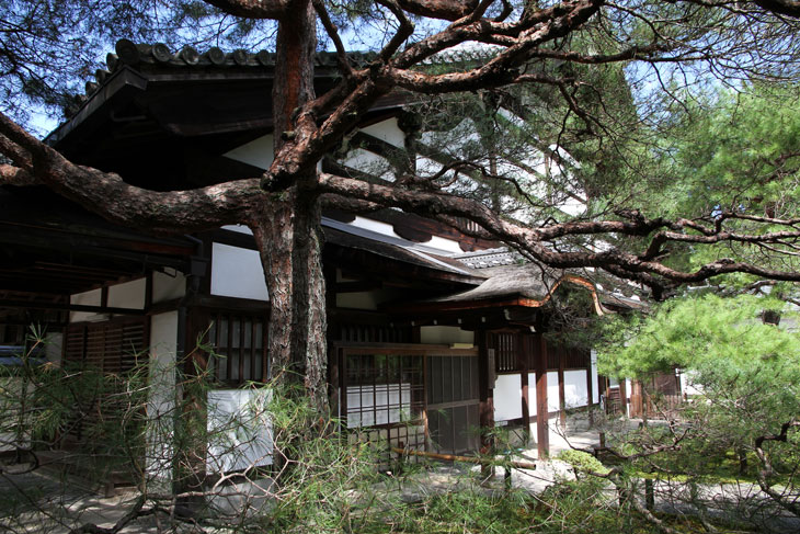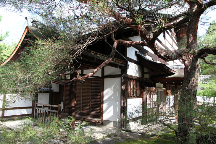 Innen sind hervorragende Gemälde der Momoyama-Zeit und der frühen Edo-Zeit zusehen (separater Eintritt wird erhoben). Die Bilder auf den Wänden stammen von Kano Tanyu und Kano Naonobu. Dahinter führt der Weg weiter zum Teehaus. Das 3 Daime (3/4 große Tatami-Matten) messende und 1627 erbaute Teehaus (Chashitsu) Hasso-no-seki mit seinen acht Fenstern (wichtiges Kulturgut) wird Kobori Enshu (1579-1647) zugeschrieben. Es gilt als das beste Teehaus der "drei größten Teehäuser von Kyoto". Im angrenzenden "Kleinen Shoin" befindet sich eines der berühmtesten Bilder, es stammt von Hasegawa Tohaku und zeigt einen Affen, der nach einem Spiegelbild des Mondes in einem Teich greift - eine Zen-Parabel für das Anhängen an Illusionen (wichtiges Kulturgut). Auch die Darstellung der "Alten Kiefer" stammt vom gleichen Künstler. Noch weiter nördlich ist ein Pavillon auf sechseckigem Grundriß angebaut (Rokkaku do).