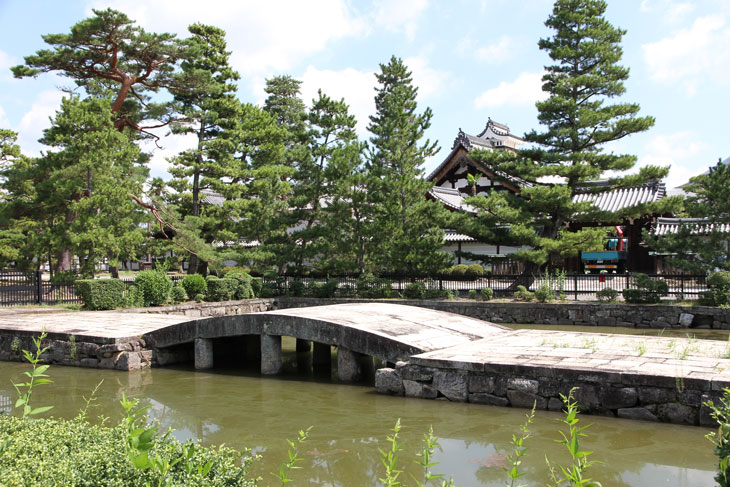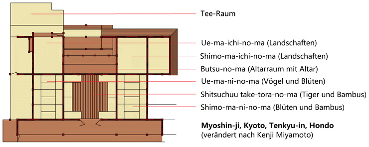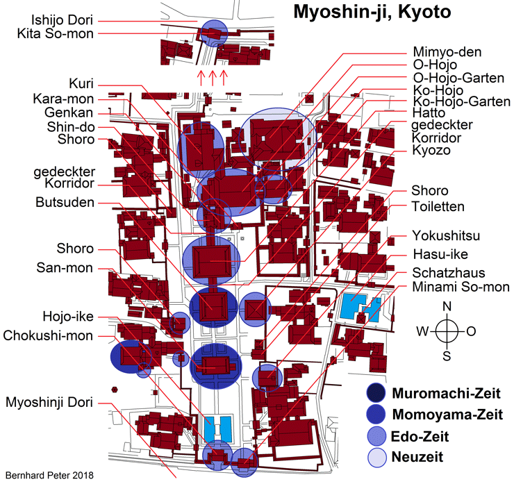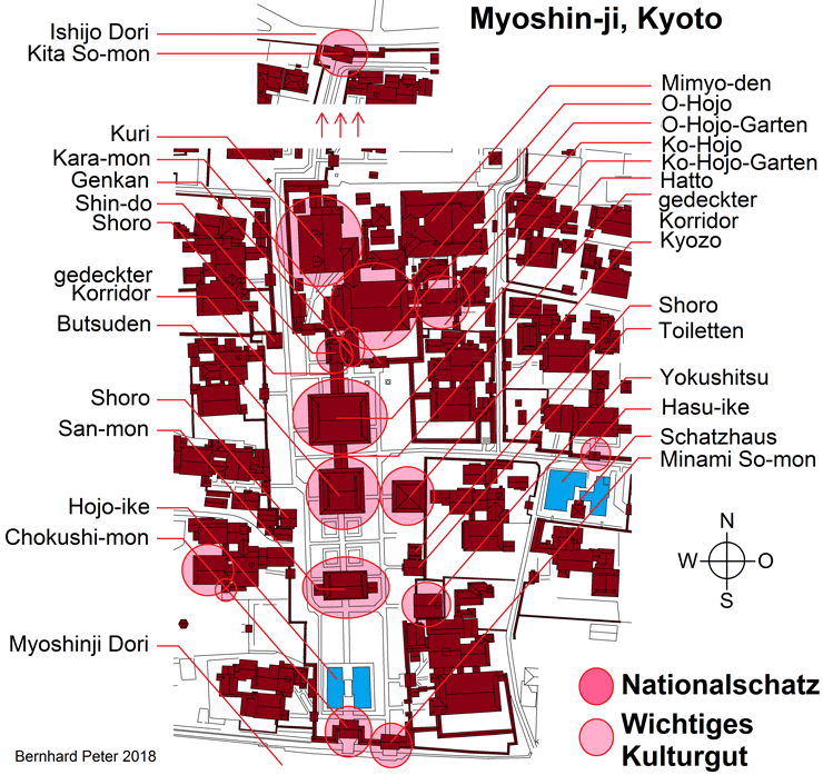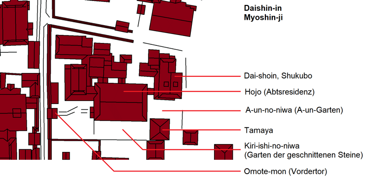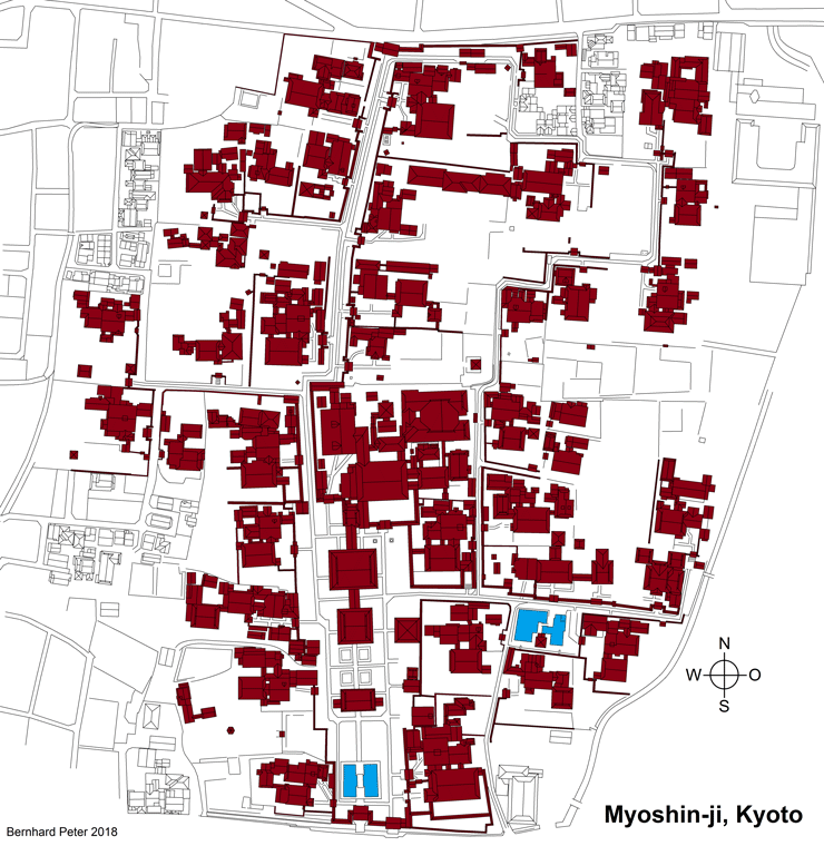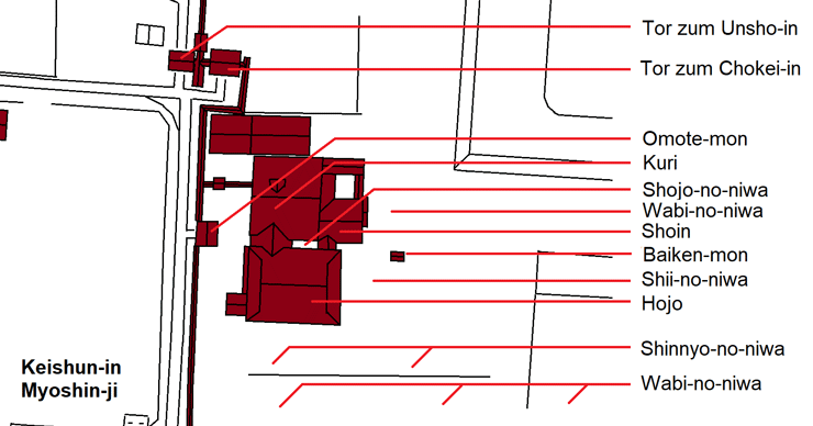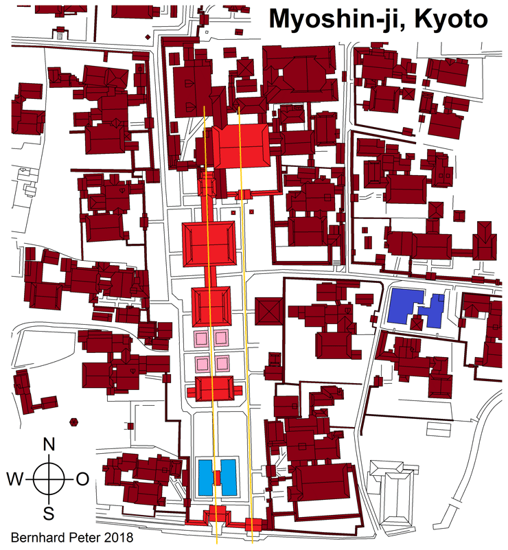 Von den Tempeln in der Stadt Kyoto ist der Myoshin-ji (Myoushin-ji) derjenige, in dem man seine Vorbilder aus China am ehesten wiederfinden kann, in der strengen Axialität, in der Symmetrie, in der Nord-Süd-Ausrichtung. In der Mitte liegt die zentrale Struktur des Haupttempels. Von Süden nach Norden reihen sich die wichtigsten und größten Strukturen, Tore, Hallen und Wohnquartiere, insgesamt werden so 290 m in Süd-Nord-Richtung entlang der zentralen Achse vom Haupttempel eingenommen, bei ca. 60-70 m Breite der die Gebäude umgebenden Freifläche. Zu beiden Seiten der Hauptgebäude verläuft ein durchgehender Fußweg. An der Myoshinji-dori im Süden liegen nebeneinander zwei Tore, zu denen jeweils eine kleine, den Bach überquerende Brücke führt. Das linke, größere, prächtigere und mit der Mauer etwas einspringende Tor ist das in der frühen Edo-Zeit im Jahre 1610 erbaute Chokushi-mon, das Tor für die kaiserlichen Gesandten, welches als wichtiges Kulturgut eingestuft ist. Es ist für den Besucher verschlossen, der statt dessen rechts daneben das in der frühen Edo-Zeit im Jahre 1610 erbaute Minami So-mon nimmt, ebenfalls ein wichtiges Kulturgut. Hinter dem Chokushi-mon liegt der Hojo-ike (Houjou-iki, Houjou-chi) , der quadratisch gemauerte, 22 m breite und 20 m lange Teich, der mittig vom Hauptweg über eine zwischen zwei Podesten in flachem Bogen gespannte Steinbrücke überquert wird, mit dem Eingangsgarten (historische Stätte besonderer landschaftlicher Schönheit). Das Minami So-mon führt den Besucher auf den rechten Fußweg, der an den Hauptgebäuden vorbei geradewegs bis zum Tor in der Mauer des Hojo-Gartens führt. Der Grundriß zeigt deutlich die beiden parallelen Achsen: Die 210 m lange Haupt- und Symmetrieachse führt vom Chokushi-mon mittig durch alle Großbauten hindurch; die zweite Achse führt an diesen vorbei vom Minami So-mon geradewegs auf das Kara-mon zu, eine eigene Achse, auch wenn die beiden Bezugspunkte 200 m voneinander entfernt sind. Auch der hinter der Mauer liegende O-Hojo selbst liegt genau in dieser zweiten Achse, damit ist die gesamte Achse sogar länger als die Hauptachse. Der erste Weg ist der "zeremonielle", der zweite Weg der "praktische".