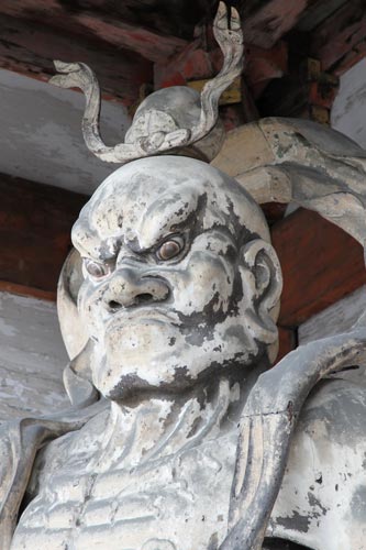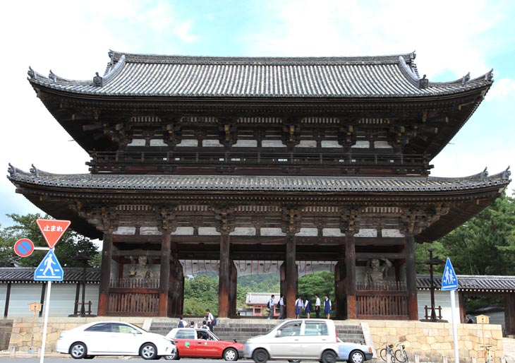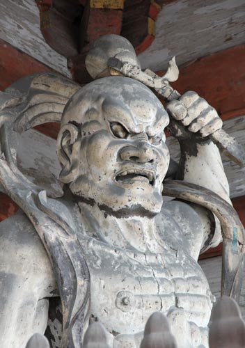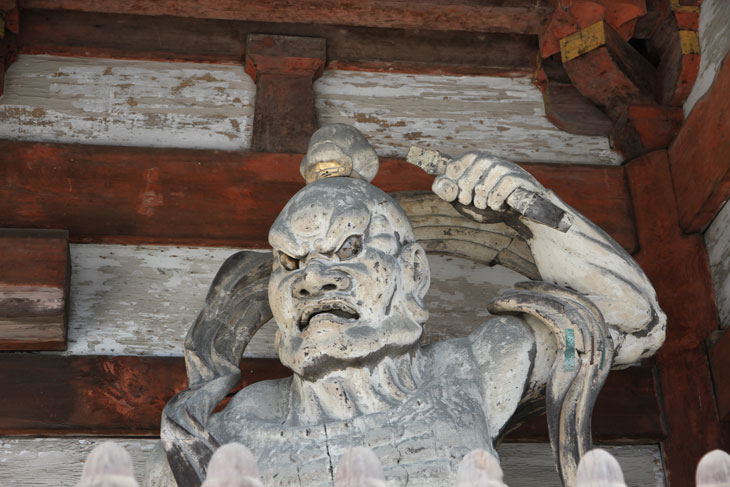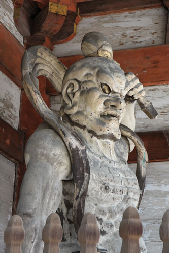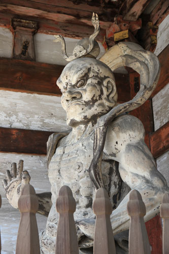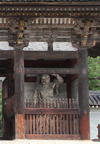 In den beiden südlichen Seitennischen befinden sich die beiden Deva-Könige, rechts die Agyo-Form mit geöffnetem Mund (Shukongoshin, Misshaku Kongo), links die Ungyo-Form mit geschlossenem Mund (Kongorikishi, Naraen Kongo). Auf der Rückseite des Toren sind die beiden seitlichen Kompartimente durch einen Lattenzaun abgetrennt und enthalten zwei Komainu, die sich noch deutlich in Kara-shishi (Kara-jishi) und Koma-inu, also in China-Löwe und Korea-Hund unterscheiden lassen. Die Agyo-Form oder A-Form ist löwenähnlich, mit geöffnetem Maul und mit Mähne, vom chinesischen Shishi abgeleitet, auf der anderen Seite steht die Ungyo-Form oder Un-Form, hundeähnlich, mit geschlossenem Maul, mit einem Horn auf der Stirn, vom koreanischen Phantasiehund abgeleitet. Gleich hinter dem Nio-mon befindet sich linkerhand ein kleines modernes Kassenhäuschen vor dem Zugang zum unteren Besichtigungsbereich. Vom Nio-mon aus kann man nach Norden die ganze breite Straße bis zum erhöht liegenden nächsten Tor, dem Chu-mon, überblicken.