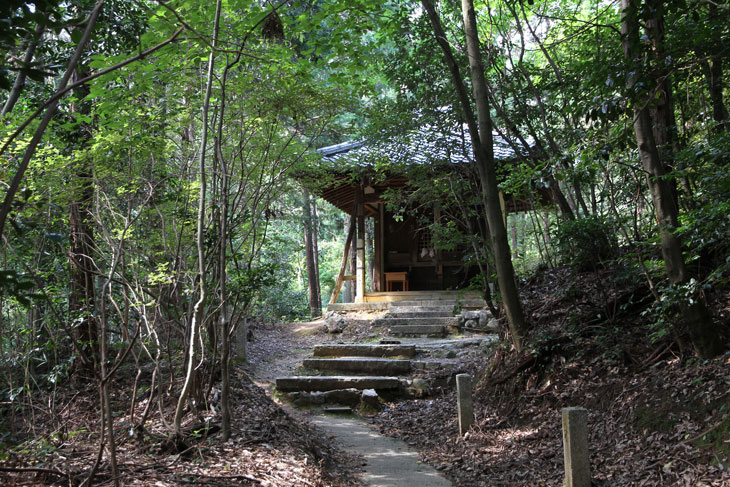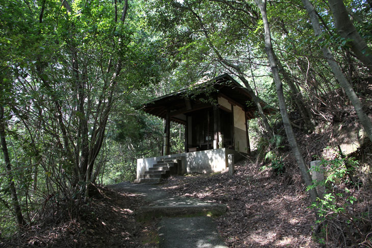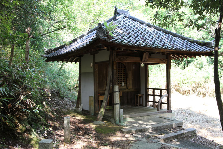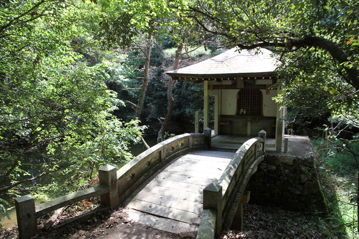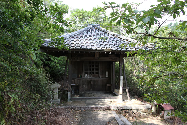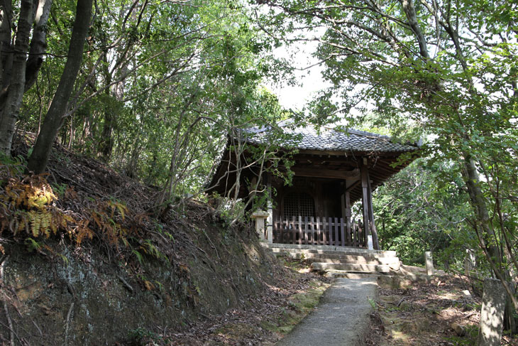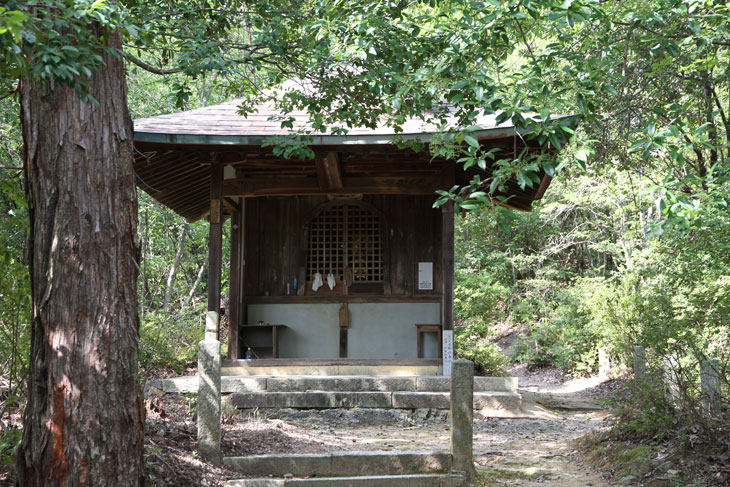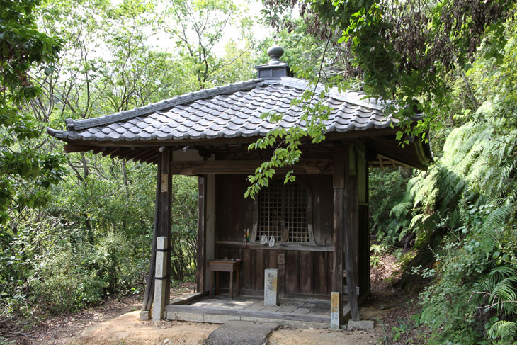 In den Hügeln hinter dem Tempel befindet sich ein Miniatur-Pilgerpfad, der mit seinen kleinen Stationen den Kannon-Pilgerweg auf Shikoku nachbildet und Hachi-ju-hak-kasho genannt wird (hachi = 8, hachi-ju = 80, kasho = Heiligtum, Tempelstation, Angleichung von hachi zu hak). Dieser Pfad dient als Miniatur-Ersatz für den 1200 km langen echten Pilgerweg. Die kleinen Tempelchen sind ganz unterschiedlich, die meisten auf quadratischem Grundriß mit kleiner Vorhalle und mit Pyramidendach, ausnahmsweise kommen auch mal sechseckige Grundrisse vor. Der Erhaltungszustand variiert. Die älteren sind komplett aus Holz. Einige davon sind baufällig, manche sehr, sehr baufällig und lehnen sich gerade noch so auf ihre schiefen Pfosten. Verwitterung und Verfall erzeugen eine gewisse Morbidität. Die Natur holt sich wieder, was ihr gehört, und gerade deswegen ist es schön, immer wieder Spuren frischer Aufmerksamkeit wie Blumen, frische Devotionalien o. ä. an den Andachtsstätten zu sehen. Die Architektur ist schlicht. Die neueren sind aus modernen Materialien auf Betonplattform und haben entsprechend weniger Charme. Durch ein kleines Gitterchen kann man ins Innere spähen, und es lohnt sich, das systematisch zu machen, es ist immer wieder eine Überraschung wie bei einem Adventskalender, was sich dahinter verbirgt. Große Kunst wird man hier nicht finden, eher das Niveau von Volkskunst, aber nett anzuschauen sind die kleinen Figuren im Inneren allemal. Man kann Medizin-Buddhas, Jizo-Figuren, Kannon-Figuren, Darstellungen von Fudo Myo-o oder berühmte Mönche identifizieren. Manche Tempelchen haben auch zwei oder noch mehr Figuren im Inneren, die besseren sogar in einem kleinen Glaskasten.
